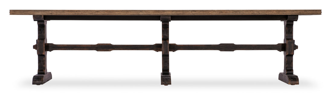 Reimagining an historical design with a fresh take on finish, function and form, the stunning Americana Trestle Cocktail table has a two-tone finish combining a parquet Oak Veneer top design with a Molasses finish on the base. Capturing the essence of a well-loved heirloom, the deep dark Molasses tone over Cathedral Oak Veneers adds warmth, while the variations in color reveal the natural beauty of the wood beneath. The base is an interlocked carved stretcher design. Solid-wood edge top.
