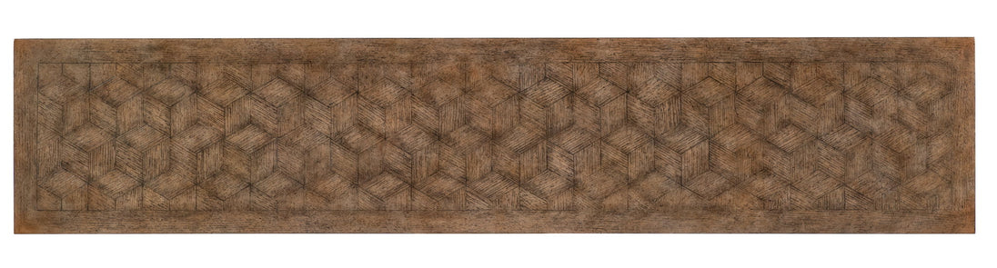 Reimagining an historical design with a fresh take on finish, function and form, the stunning Americana Trestle Console Table has a two-tone finish combining a parquet Oak Veneer top design with a Molasses finish on the base. Capturing the essence of a well-loved heirloom, the deep dark Molasses tone over Cathedral Oak Veneers adds warmth, while the variations in color reveal the natural beauty of the wood beneath. The base is an interlocked carved stretcher design. Solid-wood edge top.