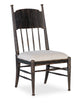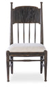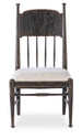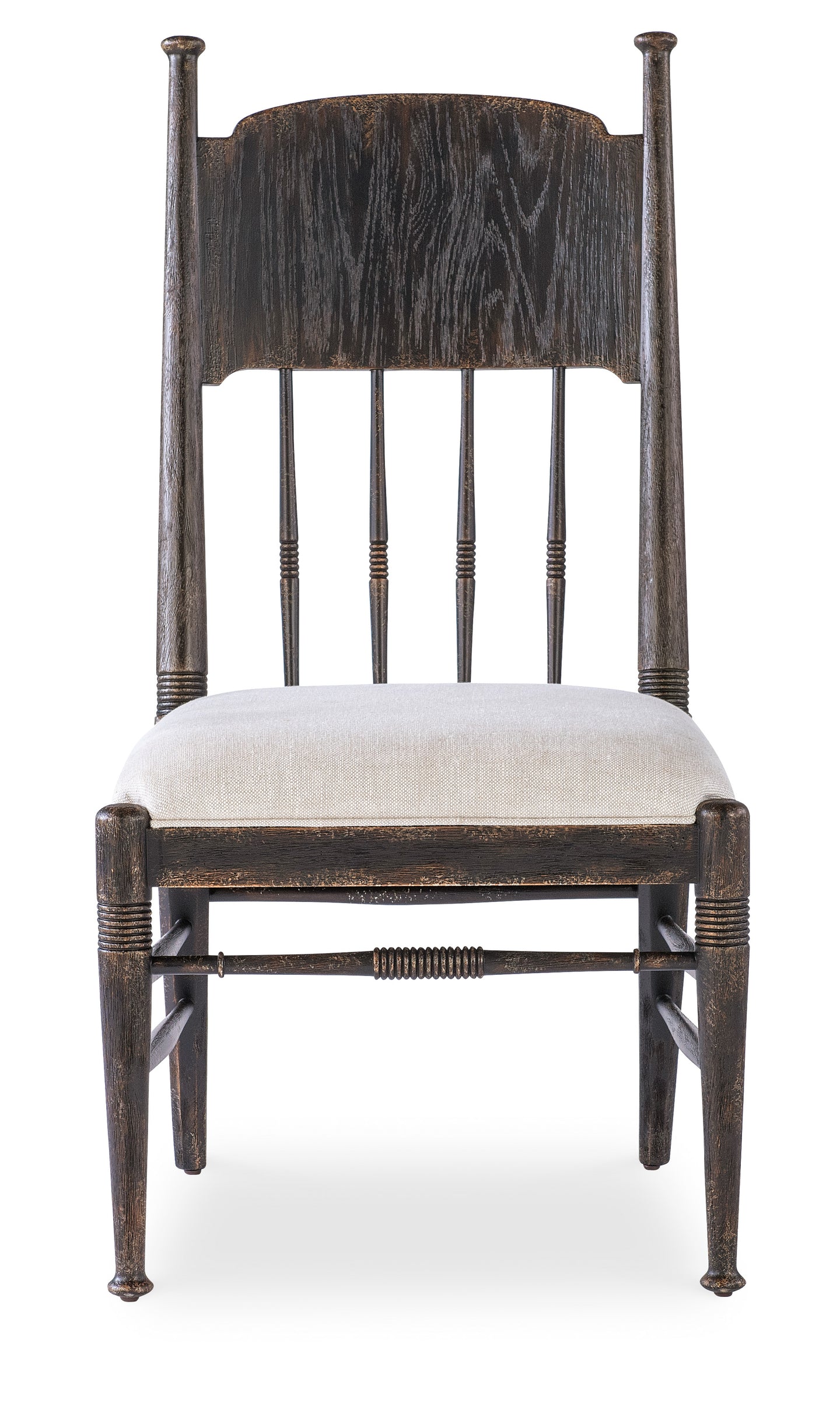 Celebrating the natural beauty of a simpler time, the Americana Upholstered Seat Side Chair has a spindle back with carved accents on the spindles and frame. Crafted of Oak Veneers with a fabric seat trimmed in welt, it is finished in the time worn Molasses finish, with the look of natural wear one might expect of pieces passed down through the family over time, revealing the rich oak character beneath. The seat is upholstered in the 100% Linen performance fabric Biscuit.