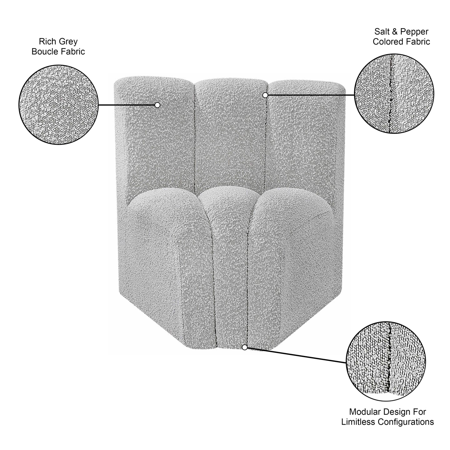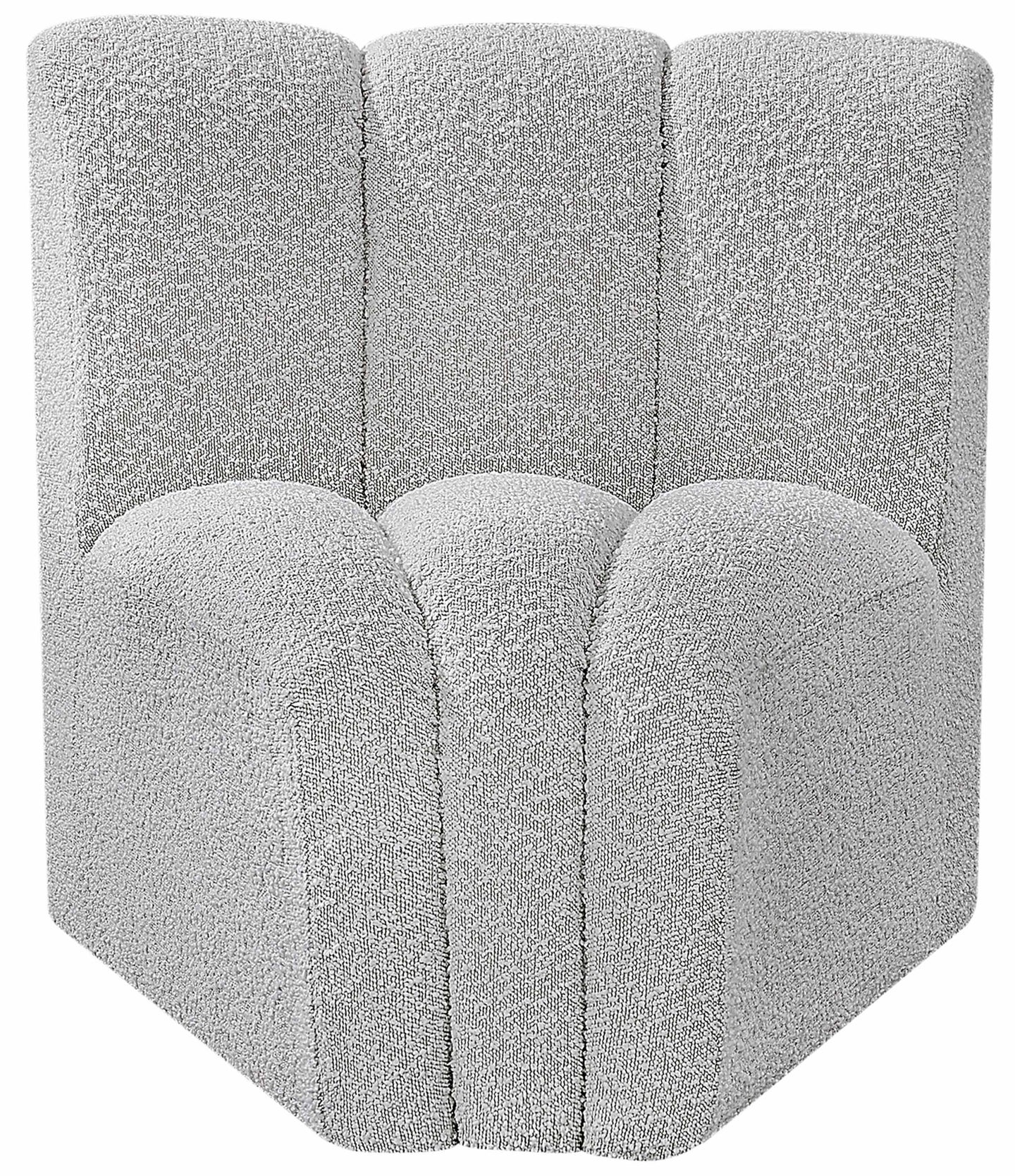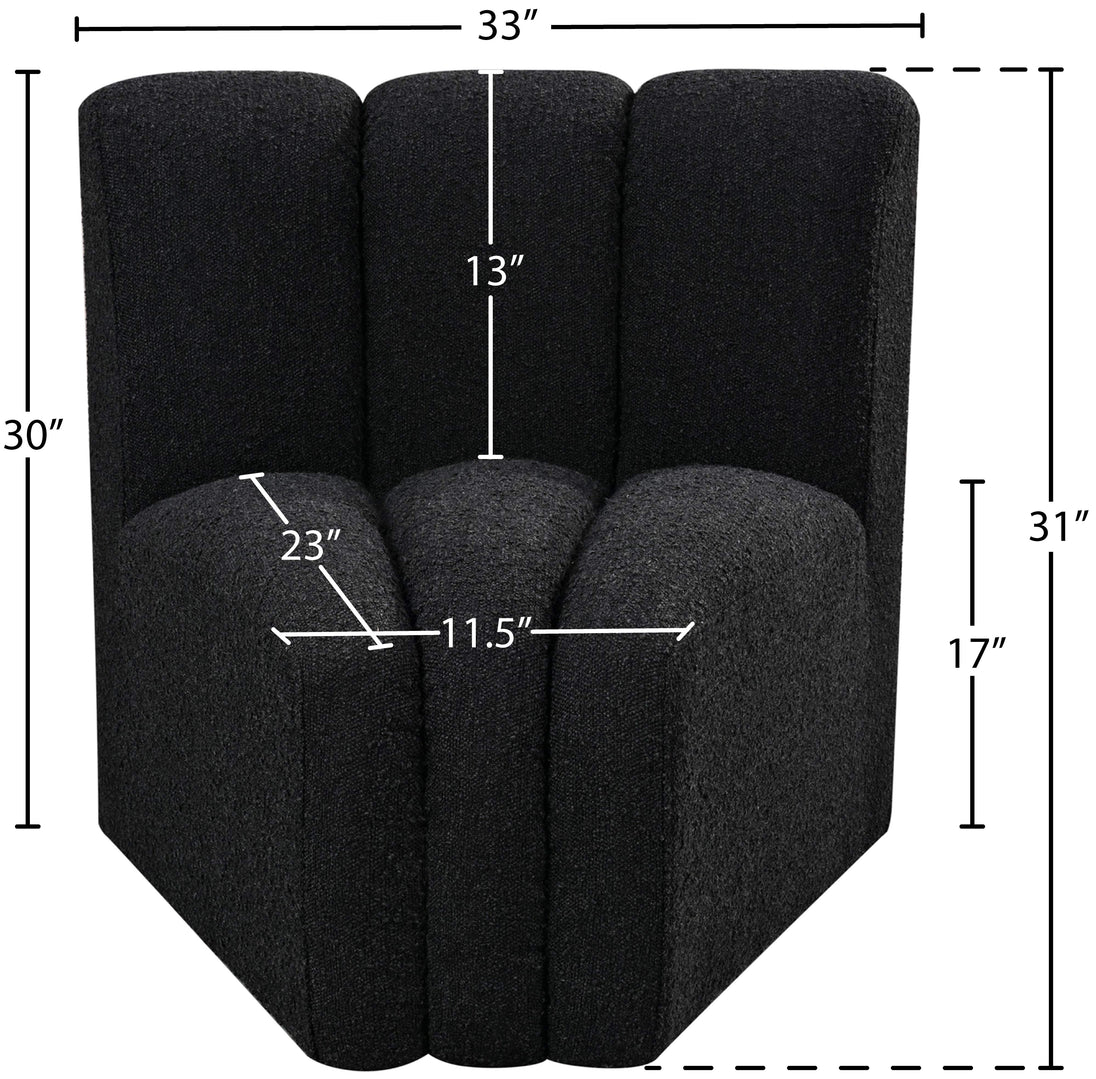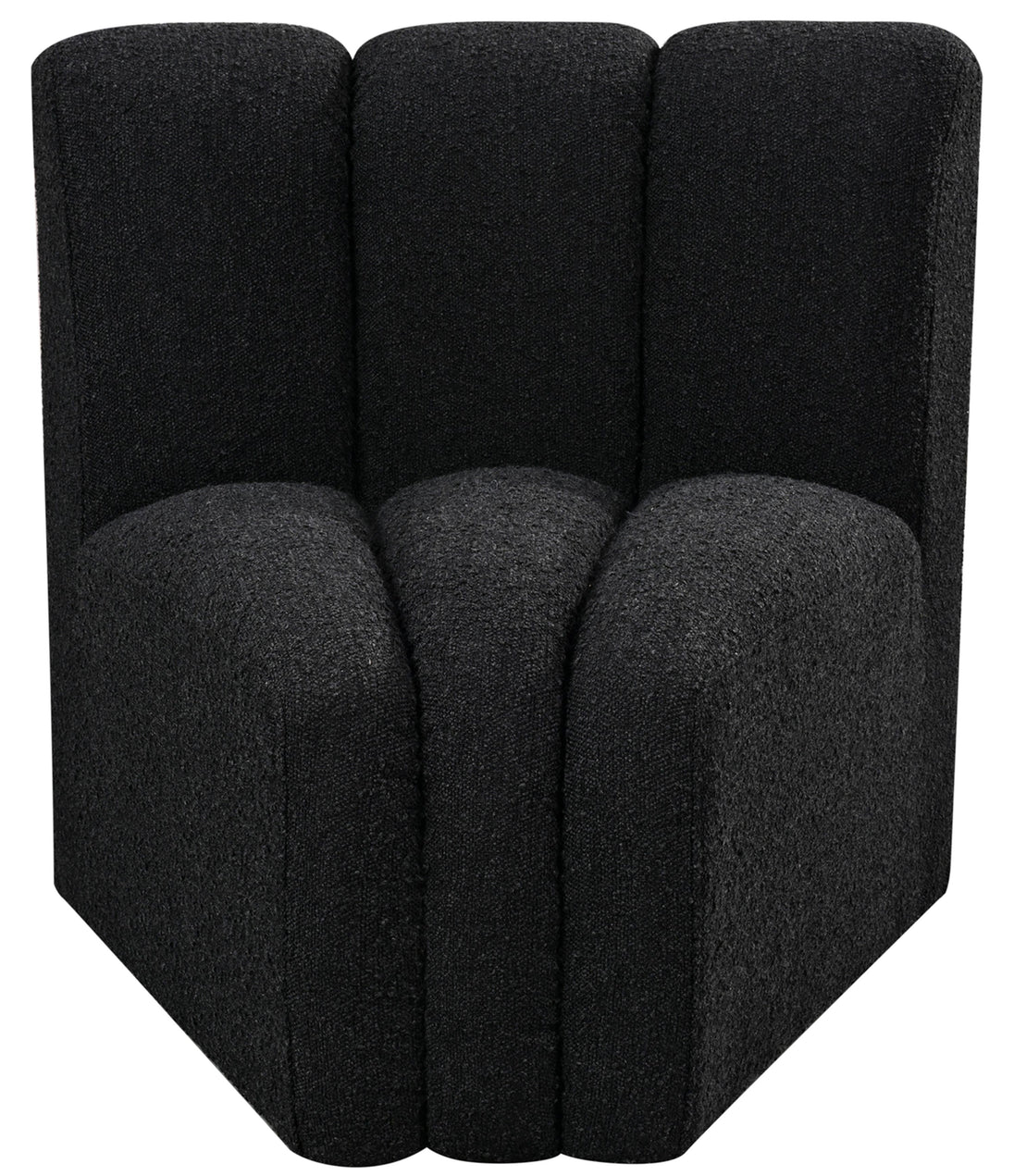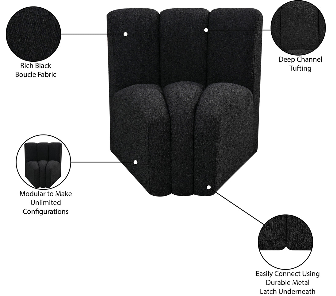 Give your living room or den the perfect blend of style and versatility with this Arc boucle fabric curved corner chair. Part of the Arc modular furniture collection, this chair comes upholstered in rich black boucle fabric and features deep channel tufting that adds a touch of luxury while enhancing comfort and support. A seamless combination of form and function, this chair can be used with other Arc pieces to create a myriad of configurations in your well-curated room.
