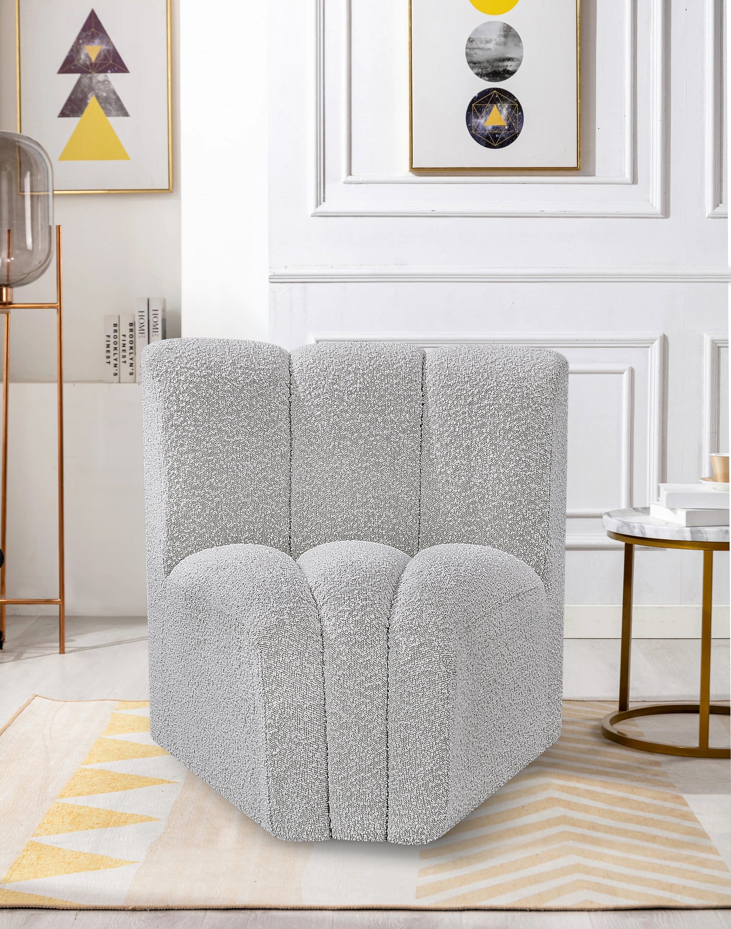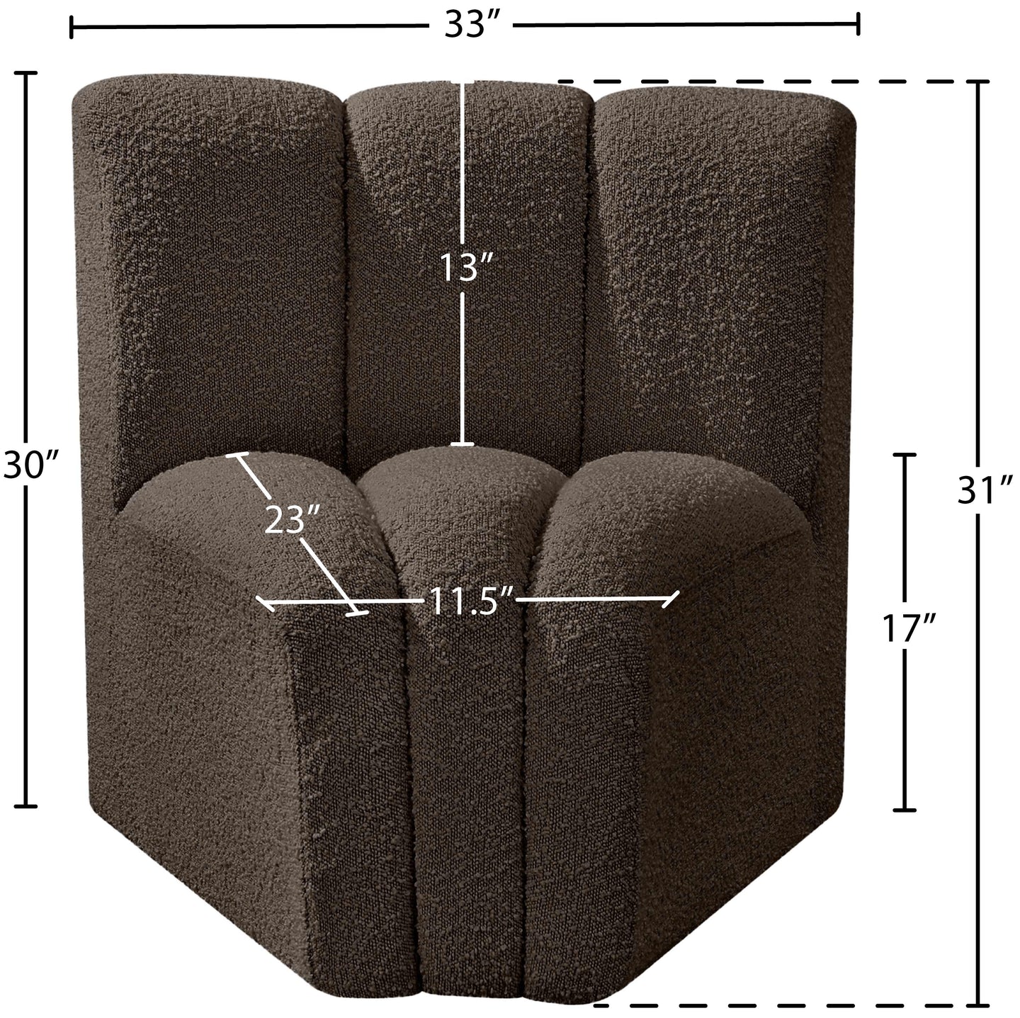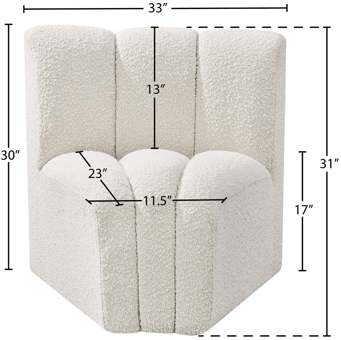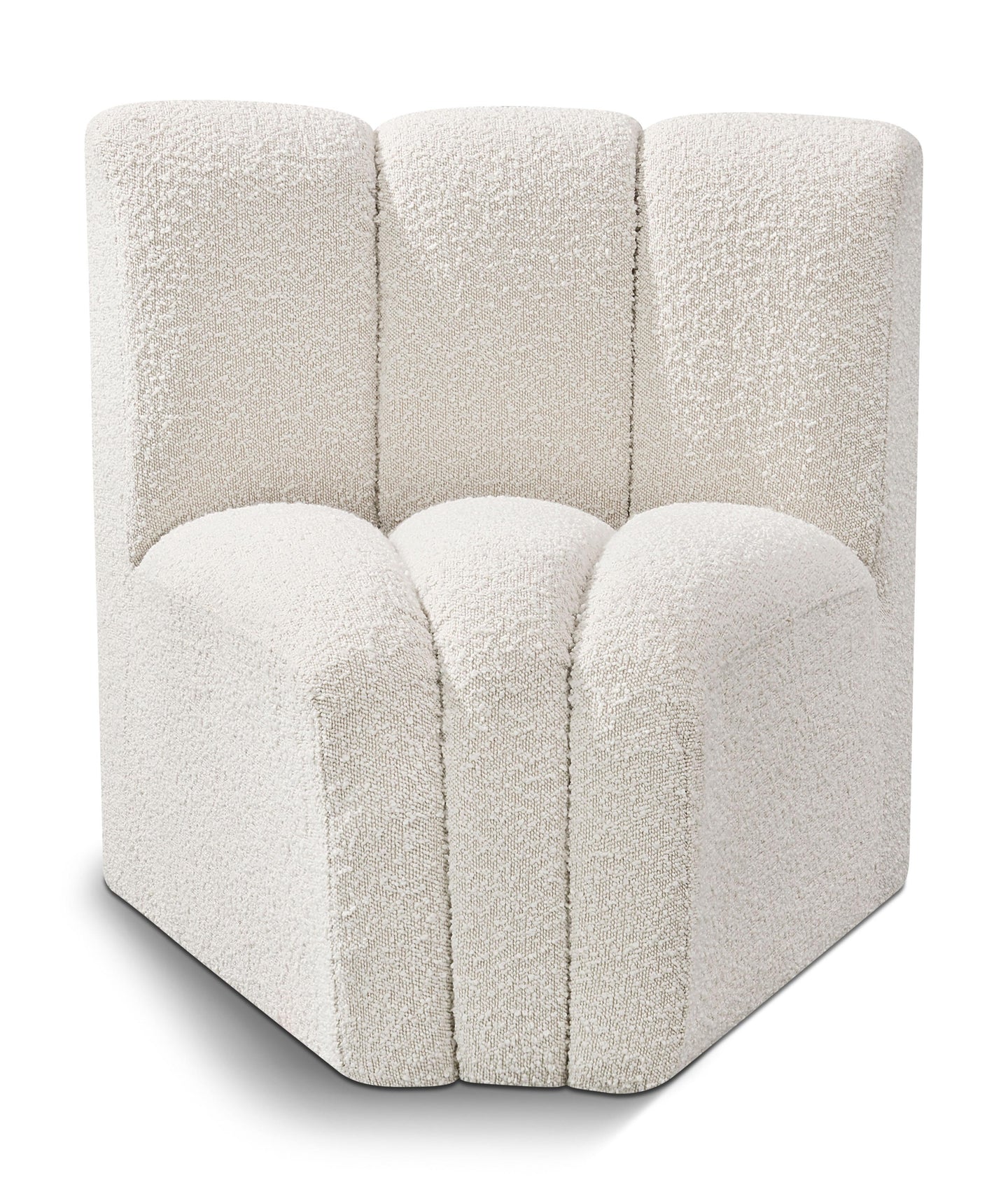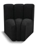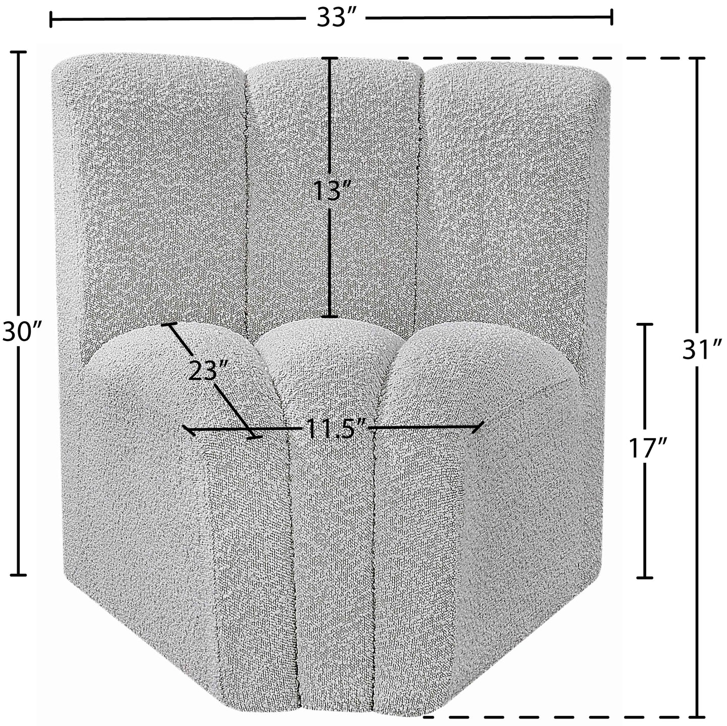 Give your living room or den the perfect blend of style and versatility with this Arc boucle fabric curved corner chair. Part of the Arc modular furniture collection, this chair comes upholstered in rich black boucle fabric and features deep channel tufting that adds a touch of luxury while enhancing comfort and support. A seamless combination of form and function, this chair can be used with other Arc pieces to create a myriad of configurations in your well-curated room.