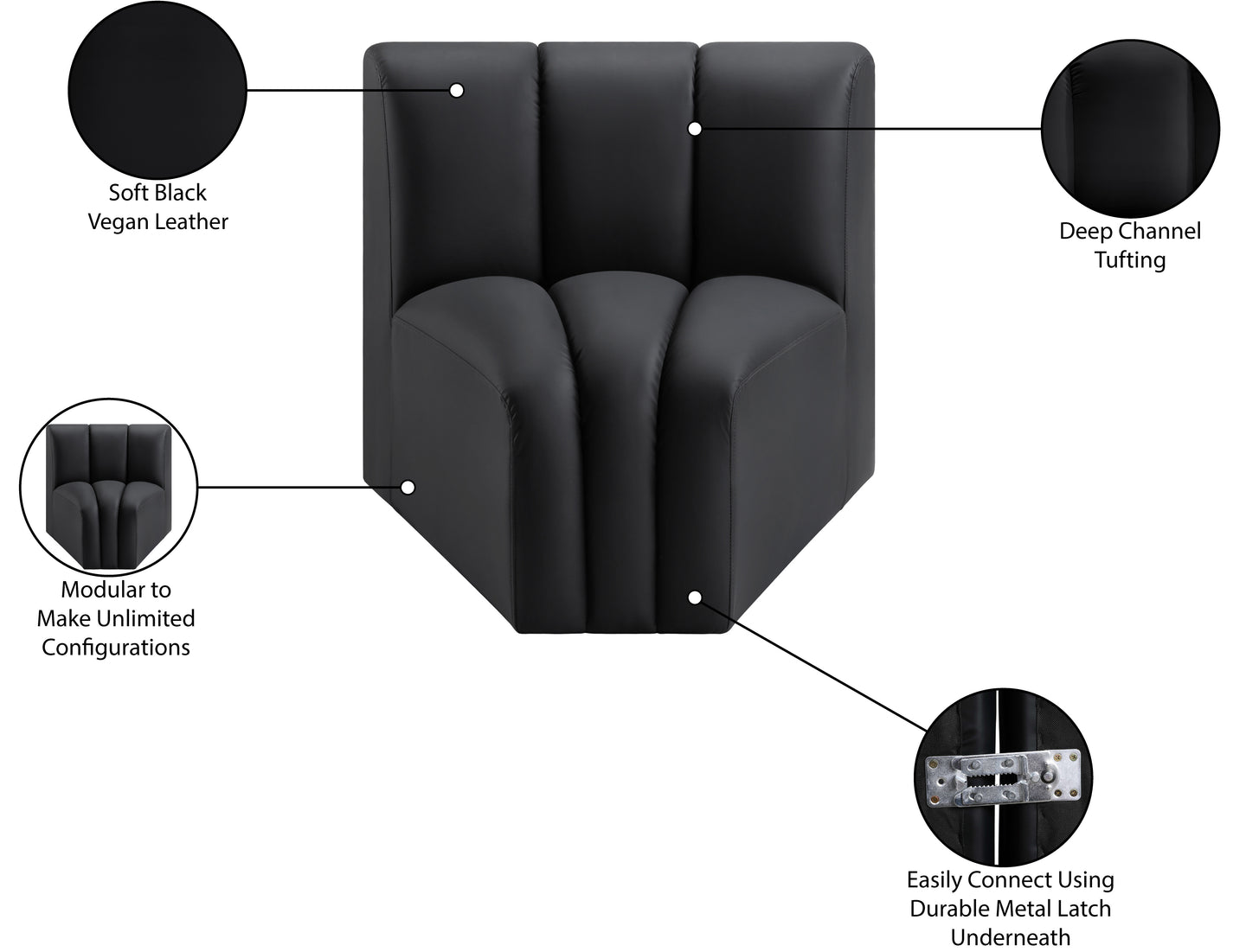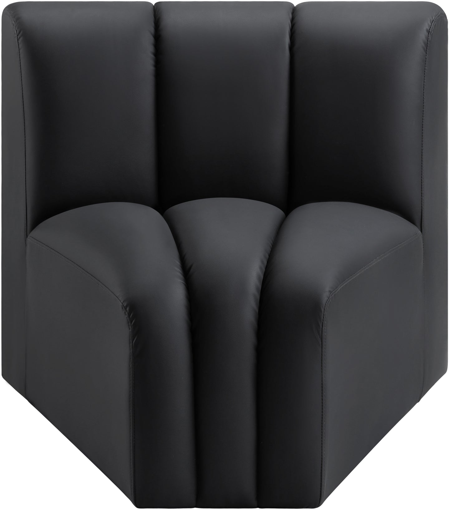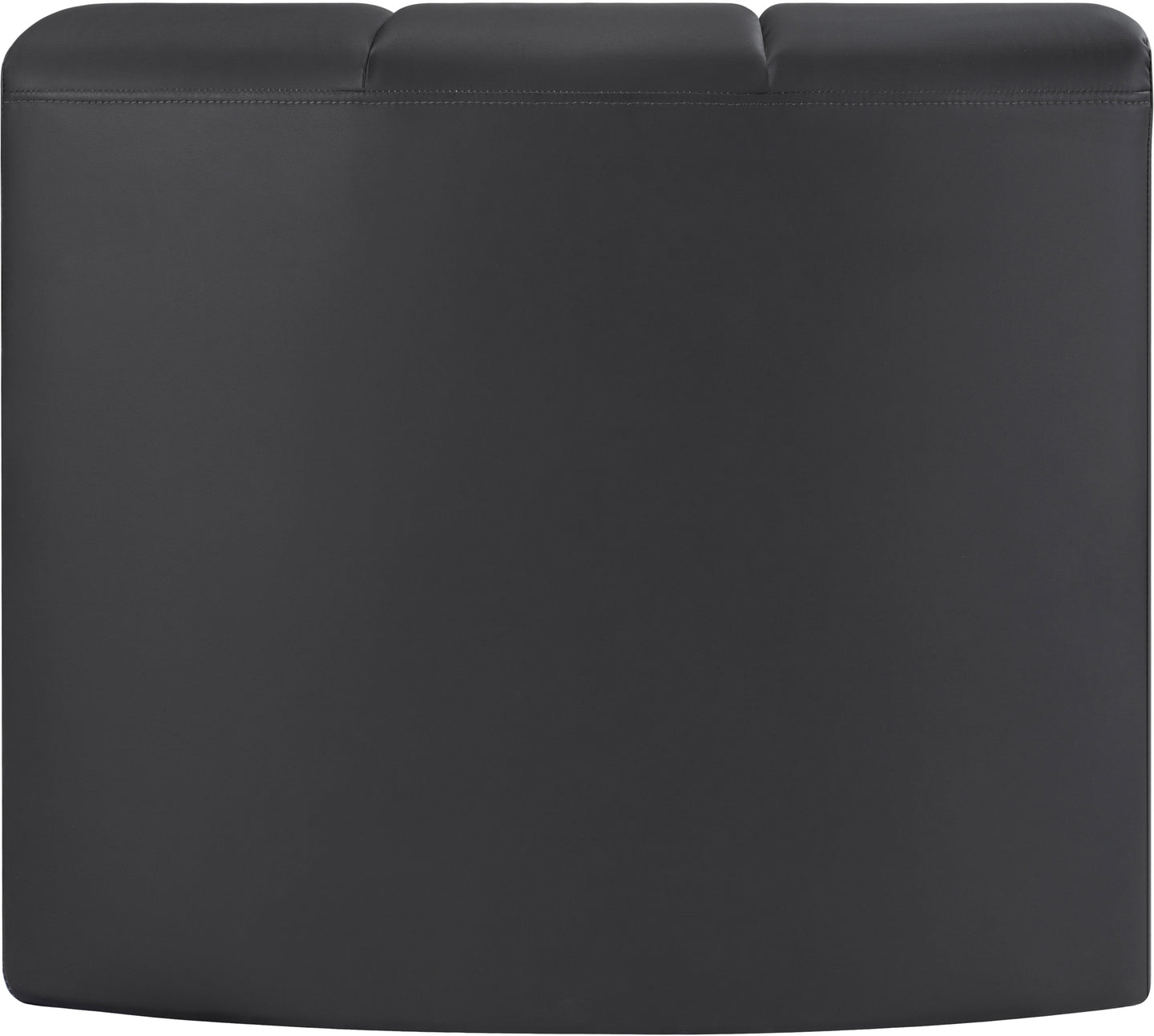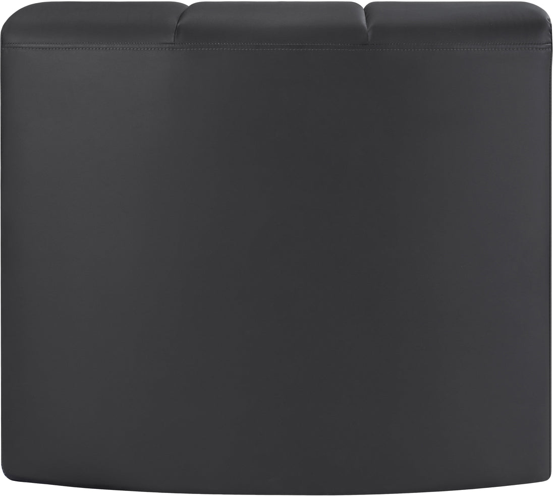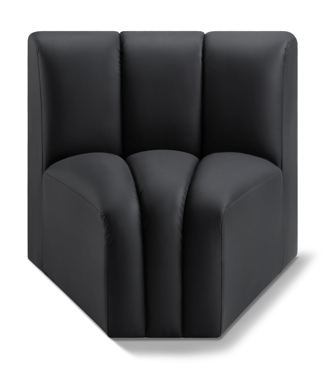 Unleash modern opulence with the Arc Vegan Leather Curved Corner. Crafted for the modern connoisseur, this chair injects an air of refined luxury into any space. Its sleek silhouette, upholstered in supple black vegan leather, exudes timeless sophistication while the deep channel tufting adds textural intrigue, further elevating the chair's visual appeal. The modular design makes it a versatile chameleon, effortlessly adapting to your evolving needs and preferences. Whether you envision it gracing a chic living room corner, basking in the glow of a bedroom window, or adding a touch of drama to a home office, the Arc seamlessly complements your unique interior aesthetic.
