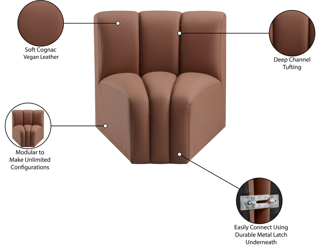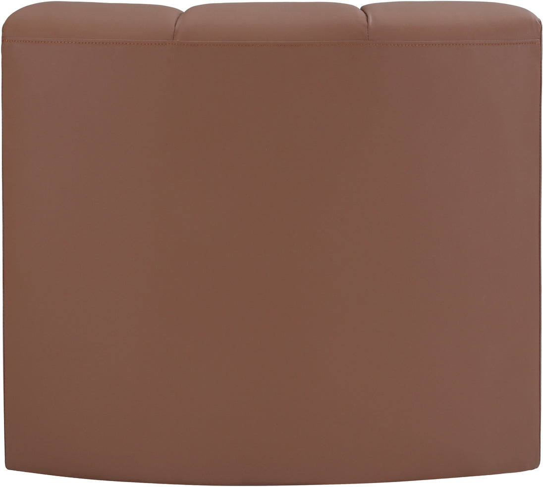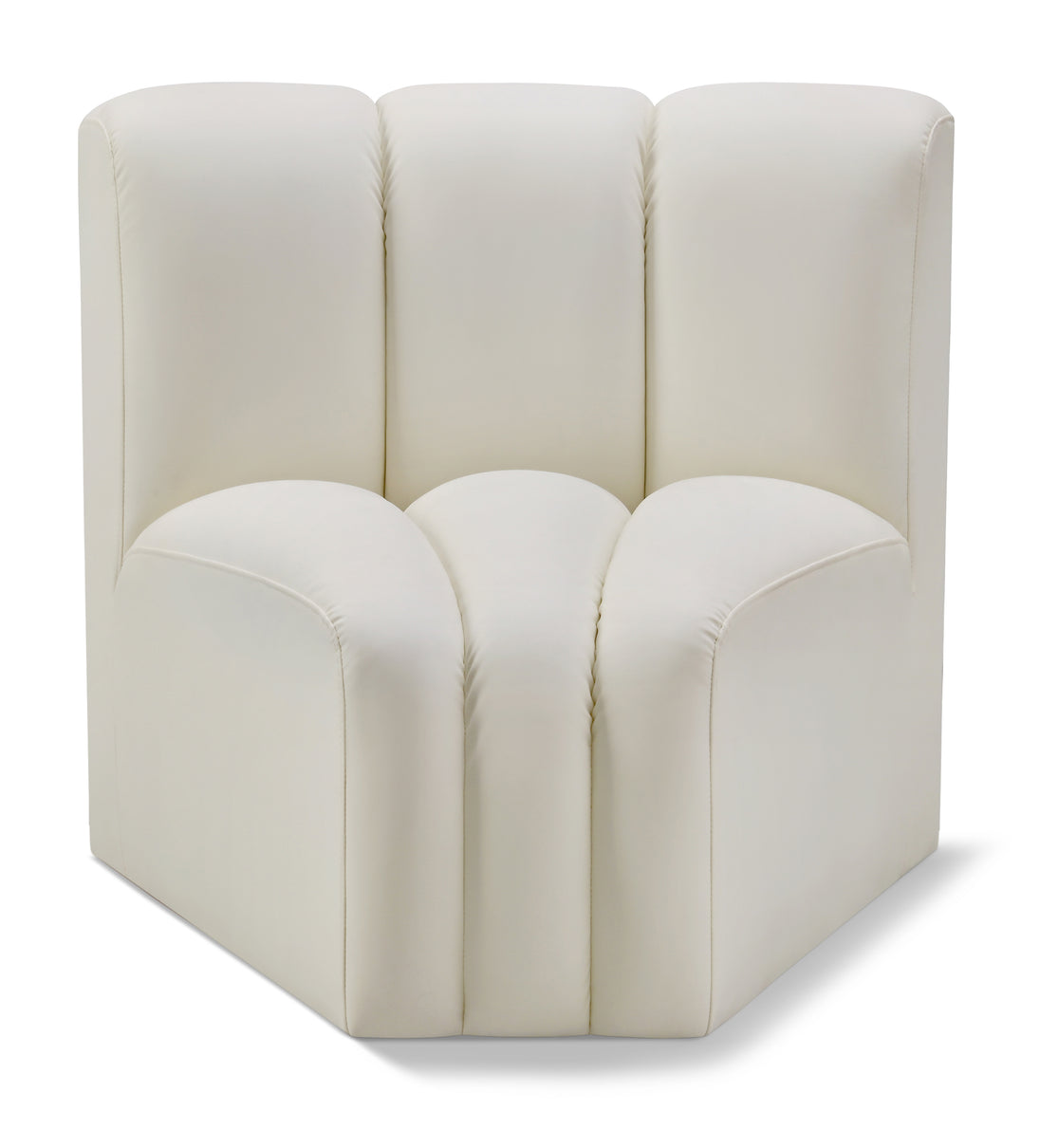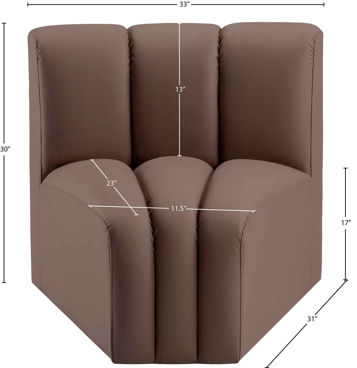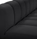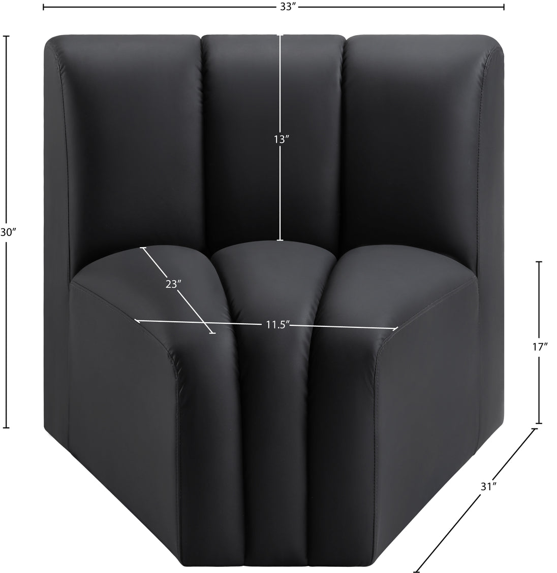 Unleash modern opulence with the Arc Vegan Leather Curved Corner. Crafted for the modern connoisseur, this chair injects an air of refined luxury into any space. Its sleek silhouette, upholstered in supple black vegan leather, exudes timeless sophistication while the deep channel tufting adds textural intrigue, further elevating the chair's visual appeal. The modular design makes it a versatile chameleon, effortlessly adapting to your evolving needs and preferences. Whether you envision it gracing a chic living room corner, basking in the glow of a bedroom window, or adding a touch of drama to a home office, the Arc seamlessly complements your unique interior aesthetic.