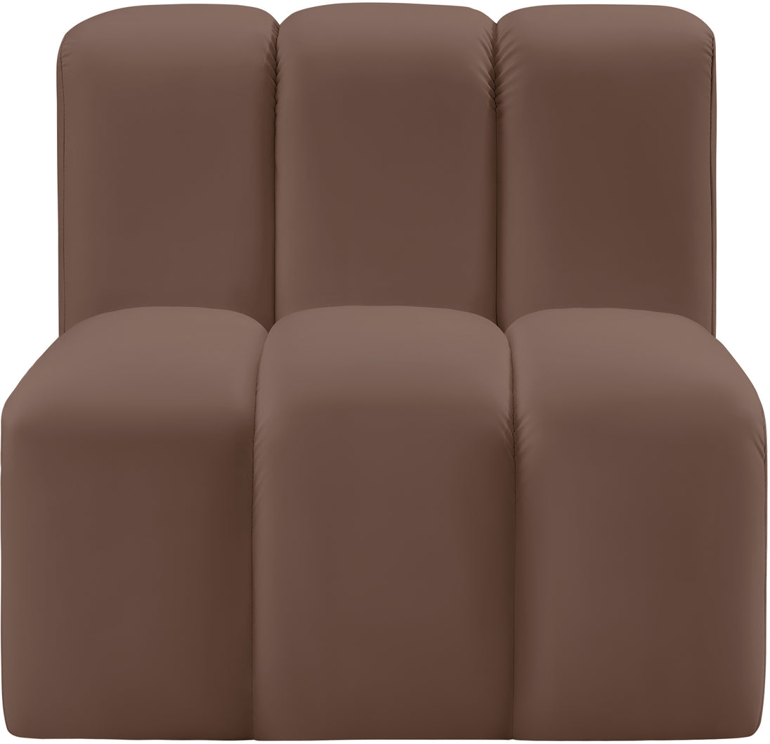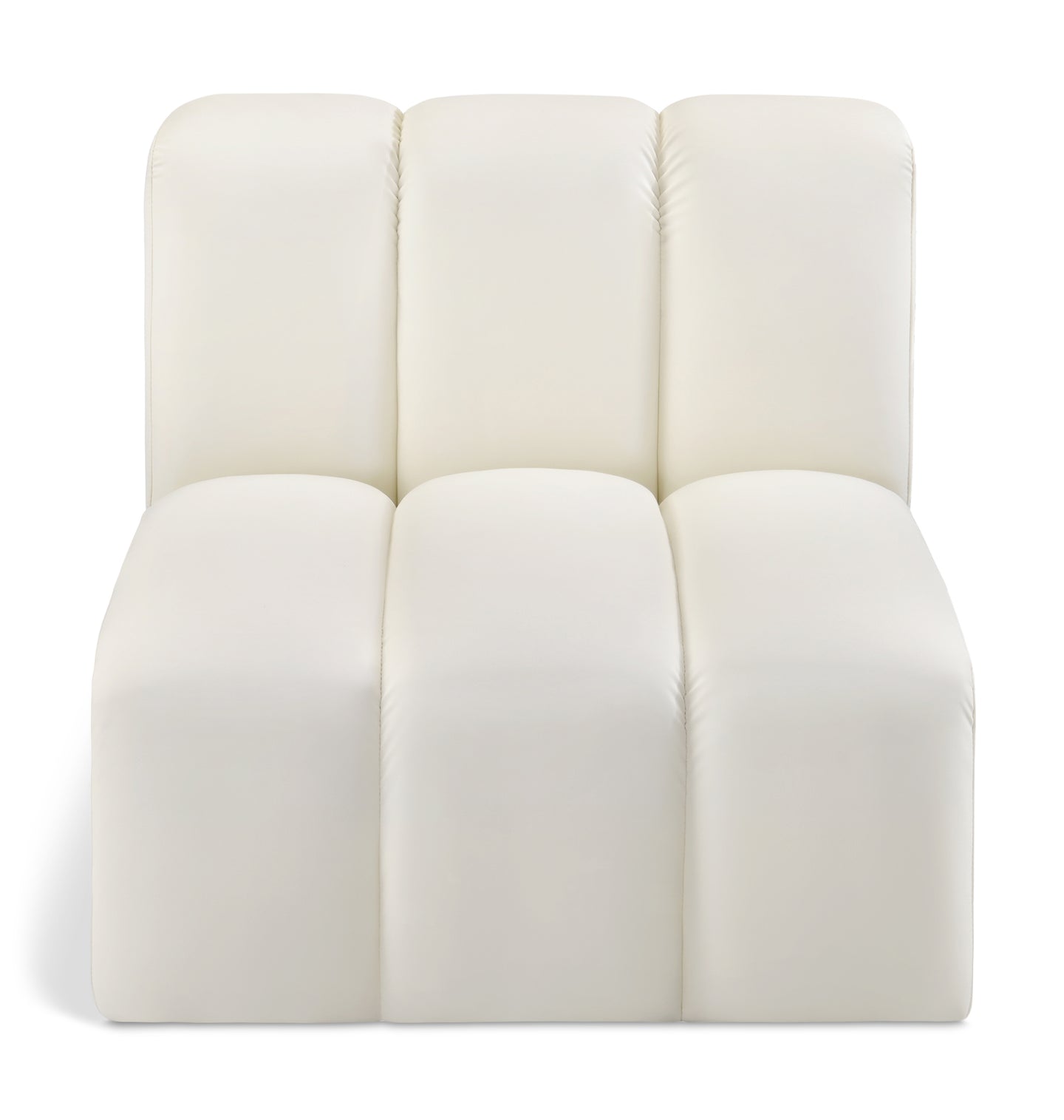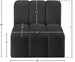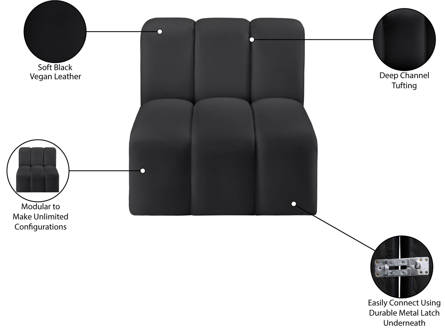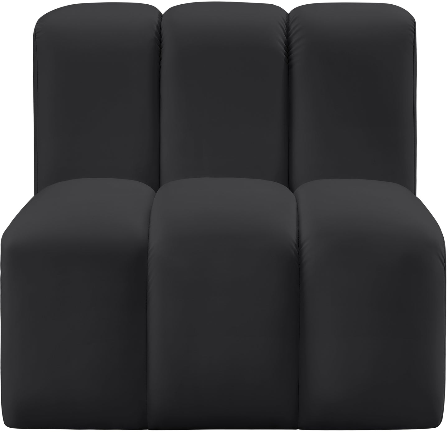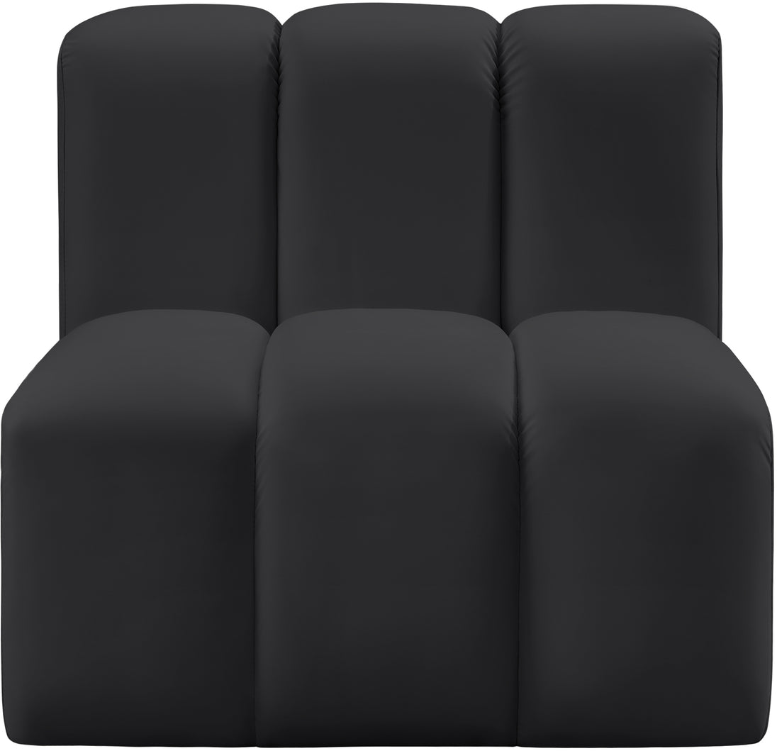 Unleash modern opulence with the Arc Vegan Leather Straight Chair. Crafted for the modern connoisseur, this chair injects an air of refined luxury into any space. Its sleek silhouette, upholstered in supple black vegan leather, exudes timeless sophistication while the deep channel tufting adds textural intrigue, further elevating the chair's visual appeal. The modular design makes it a versatile chameleon, effortlessly adapting to your evolving needs and preferences. Whether you envision it gracing a chic living room corner, basking in the glow of a bedroom window, or adding a touch of drama to a home office, the Arc seamlessly complements your unique interior aesthetic.
