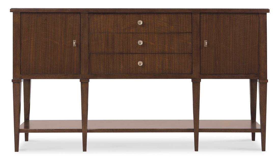 Make a sophisticated statement with the Archives Server, combining refined materials like figured walnut veneers, and a striking Castle Grey marble top. The high clarity Classic Walnut finish enhances the server’s depth and richness, while satin brass hardware adds a luxurious touch. Featuring two doors, three drawers, and an adjustable shelf, this server offers ample storage space, including a silverware tray. Perfect for the dining room, this piece offers both practical function and timeless design, ideal for those who appreciate structured elegance.