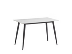 The rectangular dining table features a luxurious sintered stone top in a snowy white marble finish, offering a durable and stain-resistant surface with timeless appeal. Smooth, rounded corners and tapered black steel legs give the table a soft, contemporary edge.