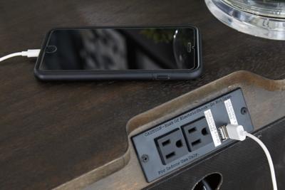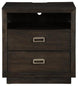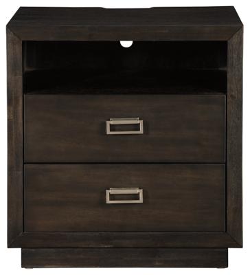 B731-92 Made of wood, mango veneers and engineered wood;Dark espresso brown finish with wire-brushed texture;2 smooth-gliding drawers and open cubby; top drawer with felt lining;Bright nickel-tone bail pulls;Contemporary plinth base;2 electrical outlets and USB charging ports;Power cord included; UL Listed