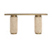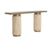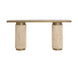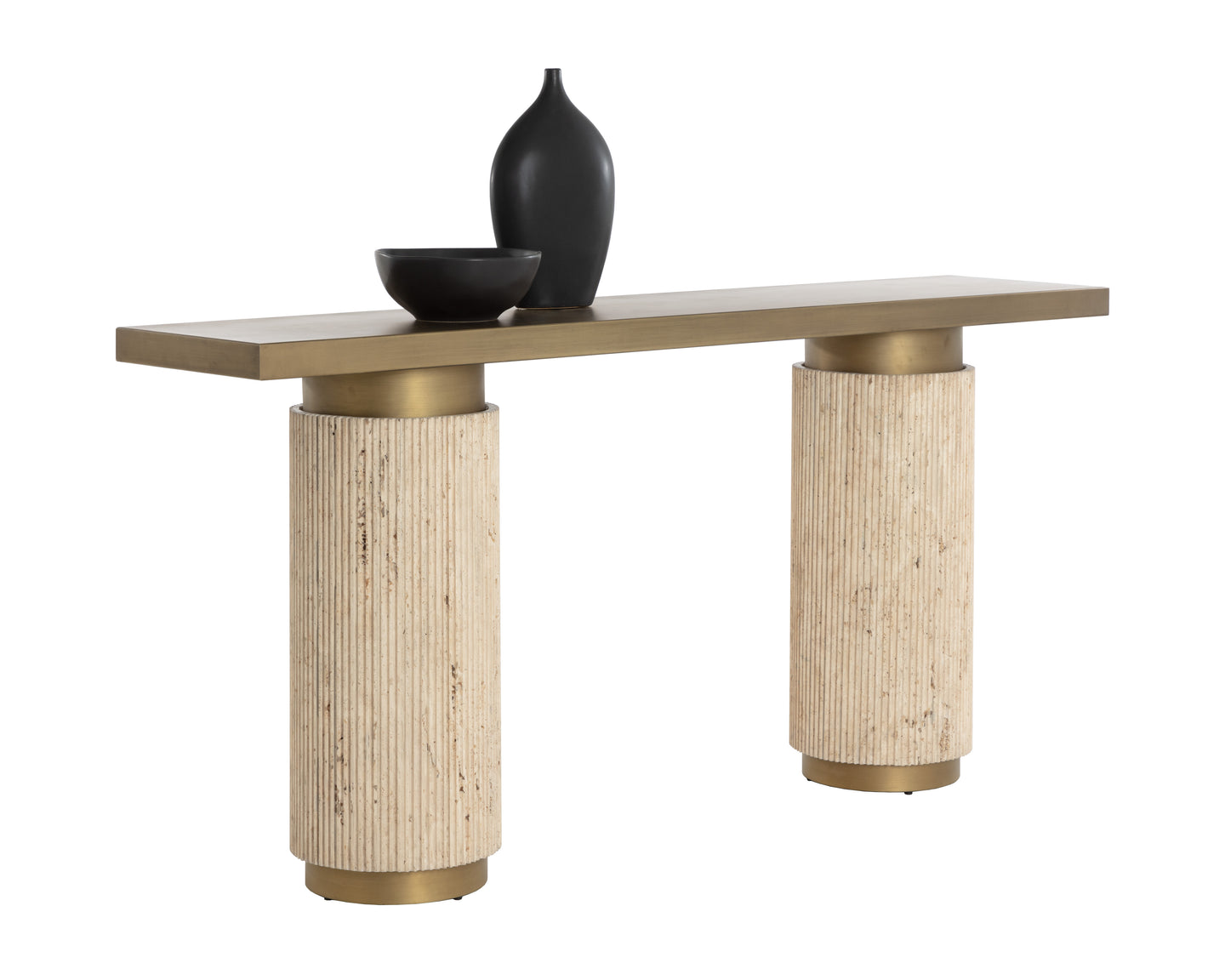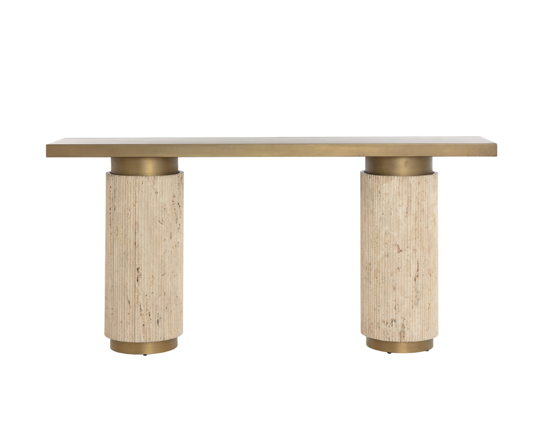 The Ashva Console Table evokes the classic beauty of Greek columns with elegantly reeded travertine wrapped around the legs. Crafted with an antique brass iron table top and base, this console table brings a refined rustic air to any interior space.