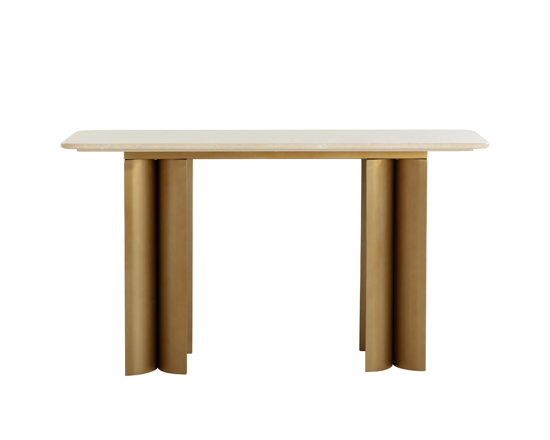 The luxuriant materials of the Astara Console Table bring a mesmerizing feel that will transform any space. A beautiful cream marble table top paired with brushed antique gold stainless steel legs lend an appreciation for sophisticated modern style.