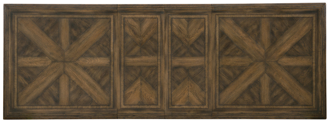 The Bandera trestle-style dining table, inspired by the bigger-than-life Hill Country of Texas, is crafted of flat-cut rustic white oak veneer for an authentic look of rustic elegance. With both 18-inch leaves, the table expands to 122 inches and seats up to 10 guests.