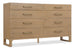 The Banyon Bay Eight Drawer Dresser offers ample storage and modern design. Made from white oak solids and oak veneers, it is finished in a light Desert Oak with wire-brushing and cerusing for added texture. The brushed brass stainless steel bar hardware adds a contemporary touch. With eight spacious drawers, including cedar-lined bottom drawers and a jewelry tray, this dresser provides ample storage for clothing and accessories. Its geometric lines and organic materials create a cohesive and casual look, perfect for any modern bedroom setting.