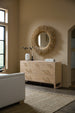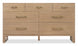 The Banyon Bay Seven Drawer Dresser offers both beauty and storage. Made with white oak solids and oak veneers, it is finished in a light Desert Oak with wire-brushing and cerusing for enhanced texture. The stainless steel custom bar hardware in a soft Brushed Brass finish adds a modern touch. With seven drawers, including a jewelry tray and two cedar-lined drawers, this dresser provides generous storage and a practical solution for organizing your bedroom essentials. Its modestly scaled design makes it a perfect fit for a contemporary bedroom, effortlessly combining natural textures with precise geometry.