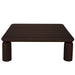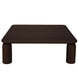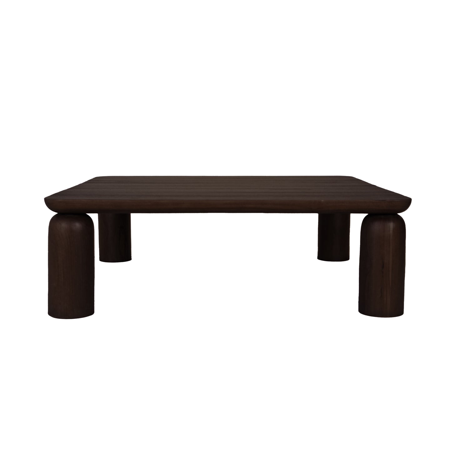 Durable and weather-resistant, the Barclay outdoor coffee table adds a playful touch to the outdoor space without compromising on elegance. This solid teak coffee table features a slatted top and round cylindrical legs in a toasted brown finish. Its unique design features a floating effect where the sloped top piece interacts with the legs, creating visual interest.