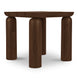 Durable and weather-resistant, the Barclay outdoor side table adds a playful touch to the outdoor space without compromising on elegance. This solid teak side table features a slatted top and round cylindrical legs in a toasted brown finish. Its unique design features a floating effect where the sloped top piece interacts with the legs, creating visual interest.