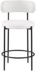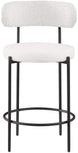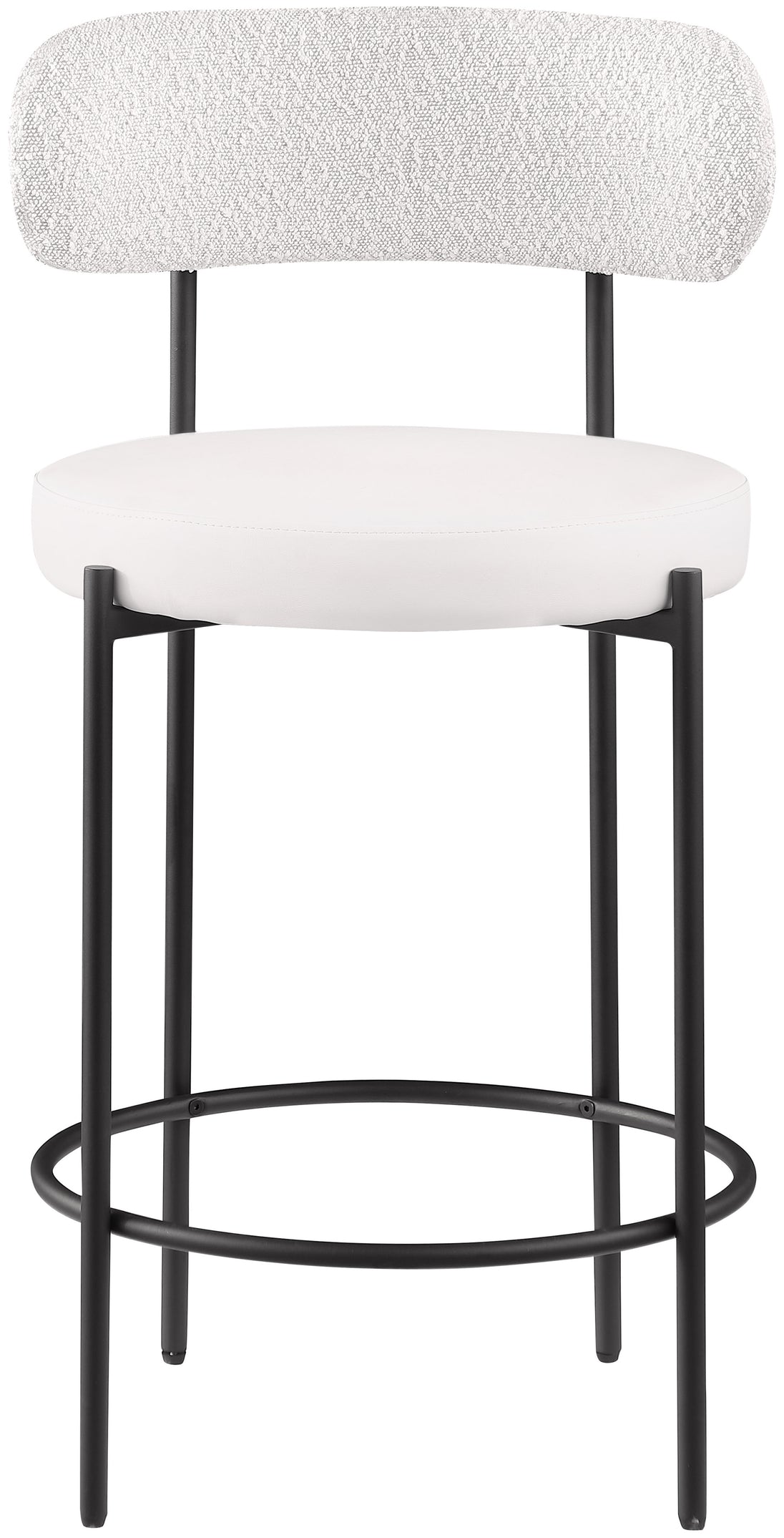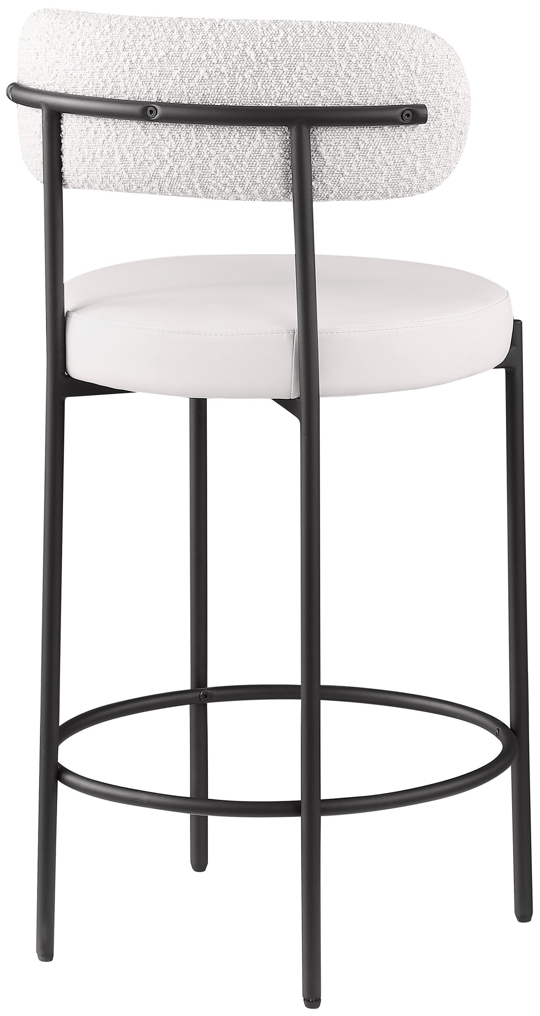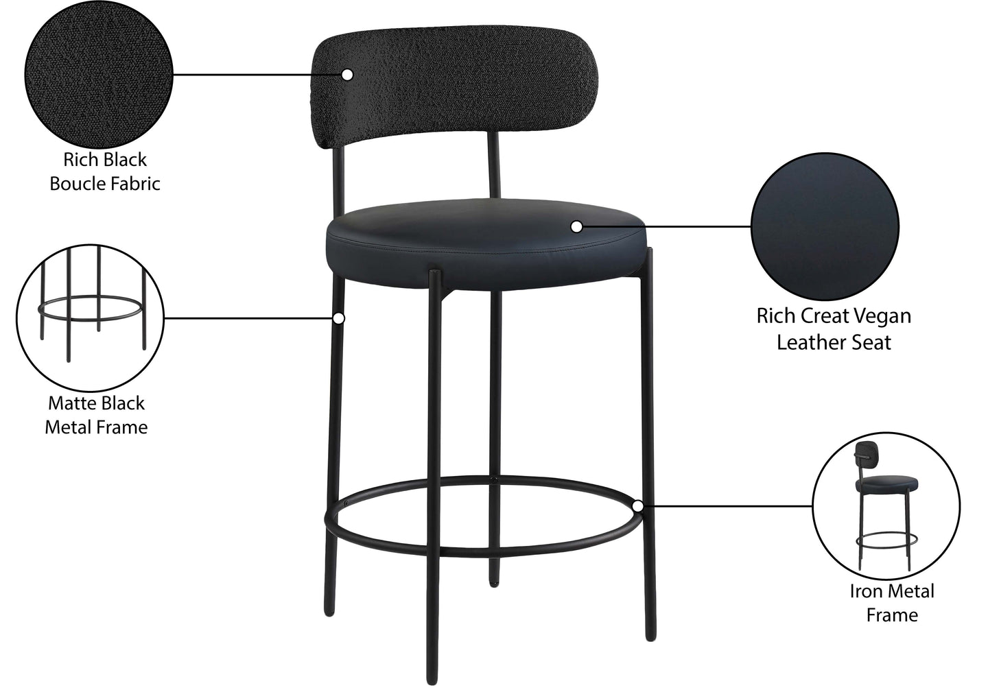 Make family, friends, and guests want to stay 'till closing time when they're seated on these Beacon vegan leather and boucle fabric bar stools/counter stools. These handsome stools are just the thing your kitchen counter or home bar is missing, with their ultra-modern design and beautiful look. The curved backs support the body while you sip a frosty cold one or nosh on some breakfast fare. A matte black metal frame gives the stools' design durability while the black vegan leather seat and boucle fabric back adds a touch of softness and comfort.