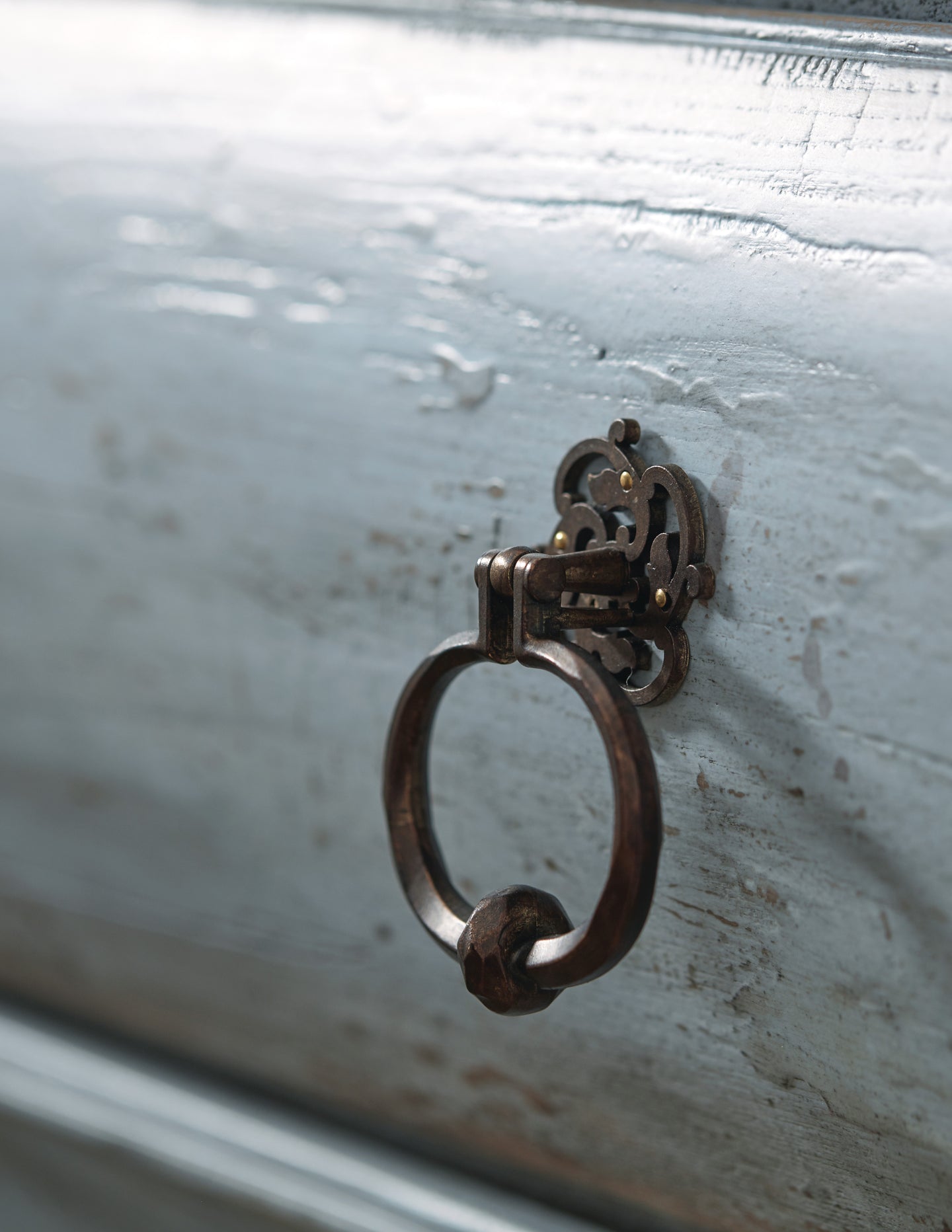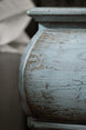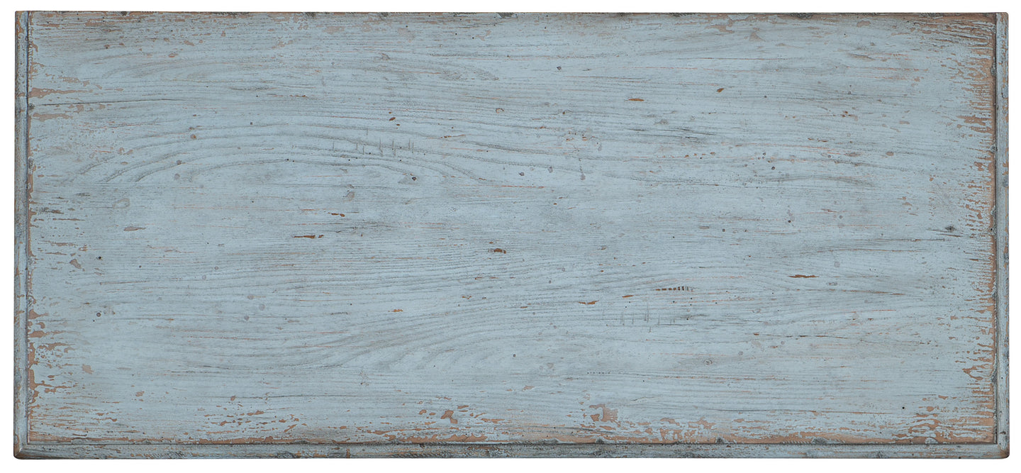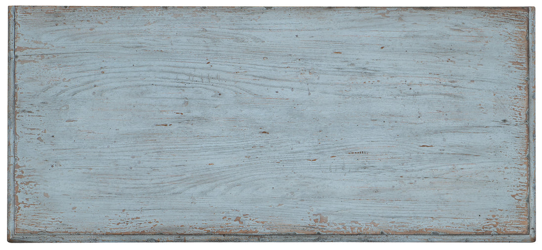 - Finish: Skylark: Blue finish with natural wood undertones. Distressing includes rasping, gouging and wormholes.