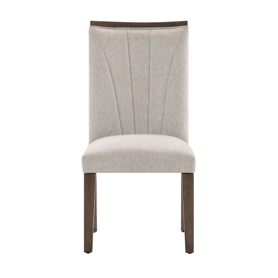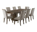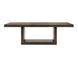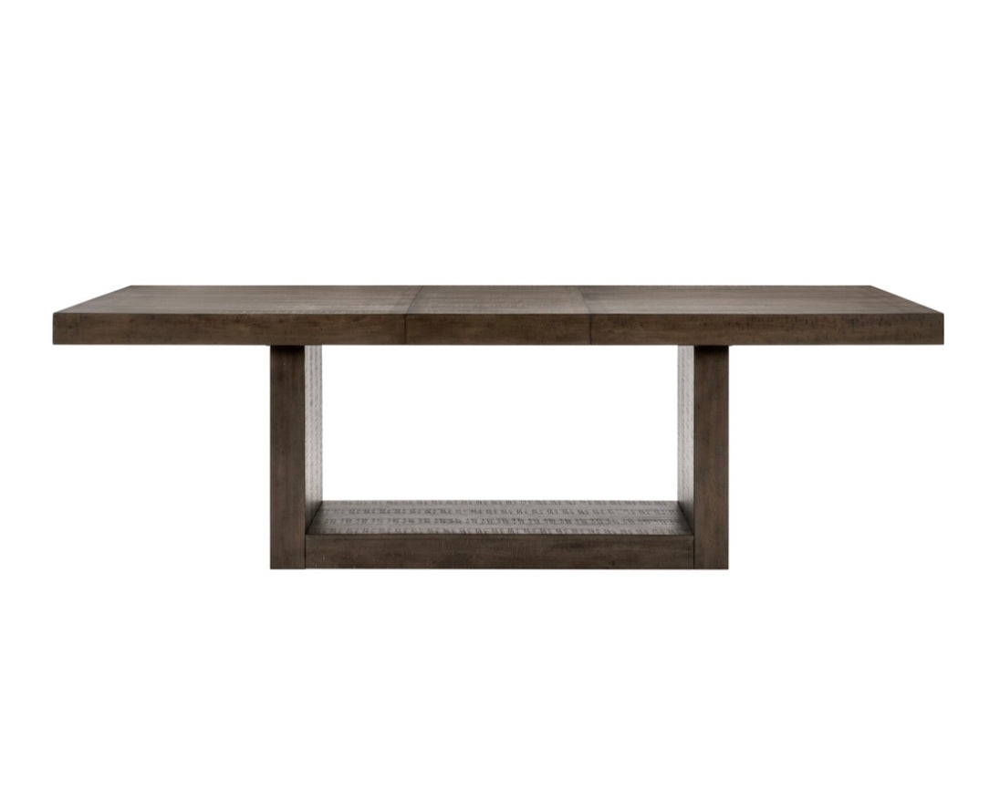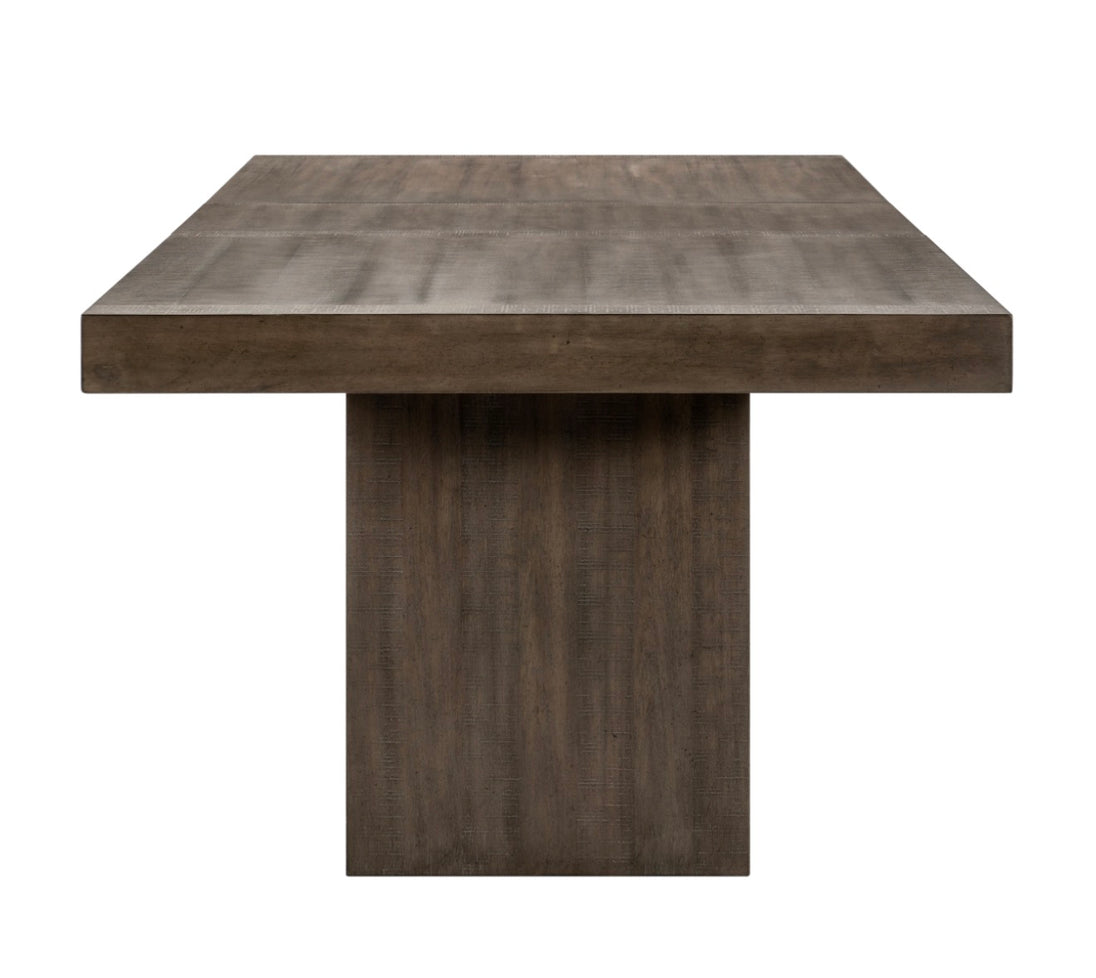 The dining table features a bold open box-frame rectangular pedestal that anchors the space with architectural appeal. Its extendable design allows you to effortlessly expand the tabletop, making it ideal for both everyday meals and larger gatherings. Coordinating side chairs are upholstered in textured gray fabric, offering comfortable seating with elegant fan-stitched seatbacks and a solid wood top rail for added durability and style.