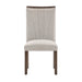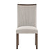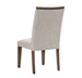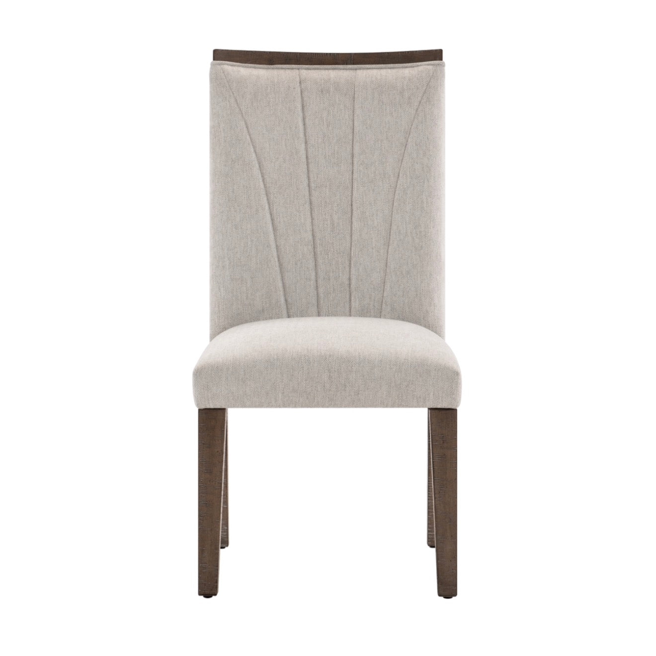 - Side chairs with textured gray fabric upholstery and fan-stitched backs