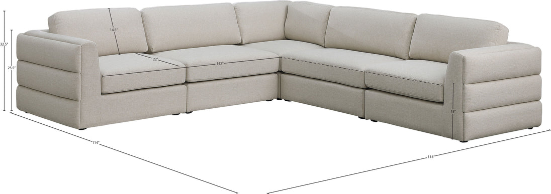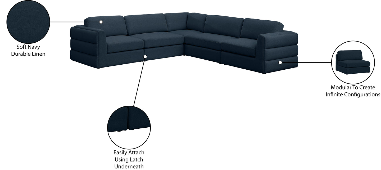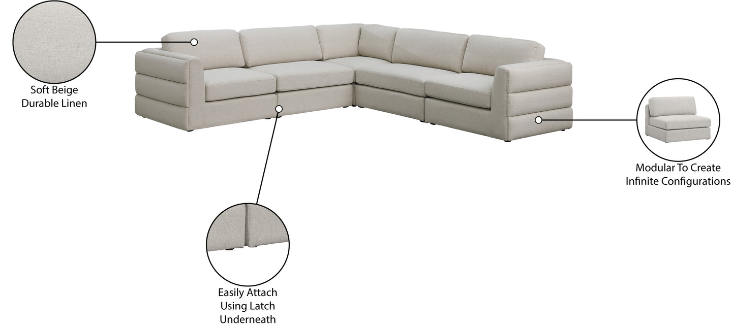Liven up your living space with this Beckham beige durable linen polyester fabric sectional. Its beige color complements any contemporary home decor, while its durable linen and polyester fabric upholstery provides you with a soft and comfortable place to sit. This sectional is modular, so you can create infinite configurations, which are easily attached using the attachment latch underneath. Its linen, wood, and foam construction guarantees stability for years to come.