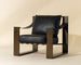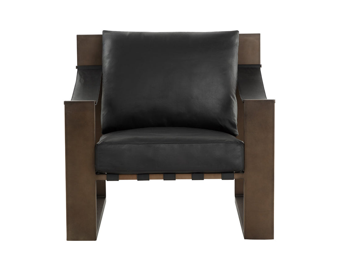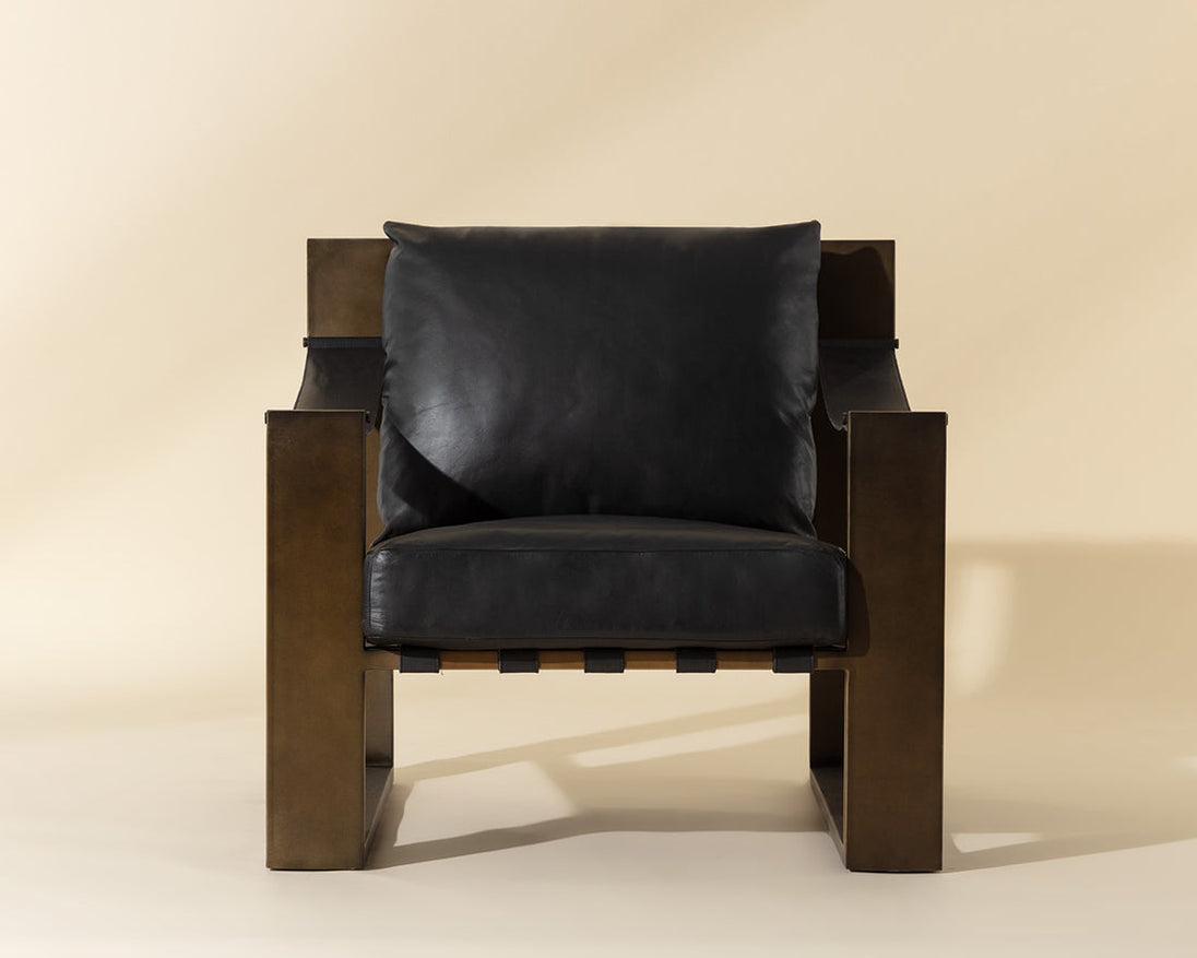 The Berke Lounge Chair brings an impressive modern look. Soft cushions are upholstered in buttery charcoal black leather with matching leather strap detailing. A strong iron frame lends this lounge chair a bold, geometric design.