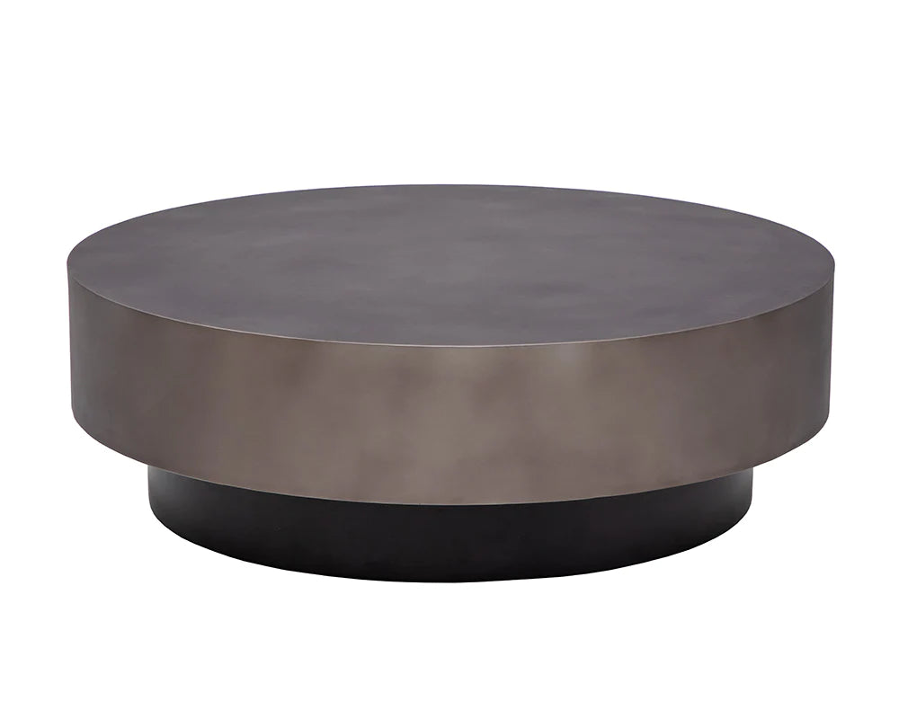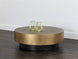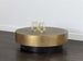 A stunning round coffee table crafted in India exudes contemporary elegance. Features a metal top with a hand-painted antique brass finish supported by a black base. Suitable for residential and commercial living and lounge environments. Coordinating end table also available. Made in India. With refined craftsmanship, this design was brought to life by skilled local artisans. By nature, these materials develop unique imperfections such as fissures, markings and colour variations for a truly one-of-a-kind piece.