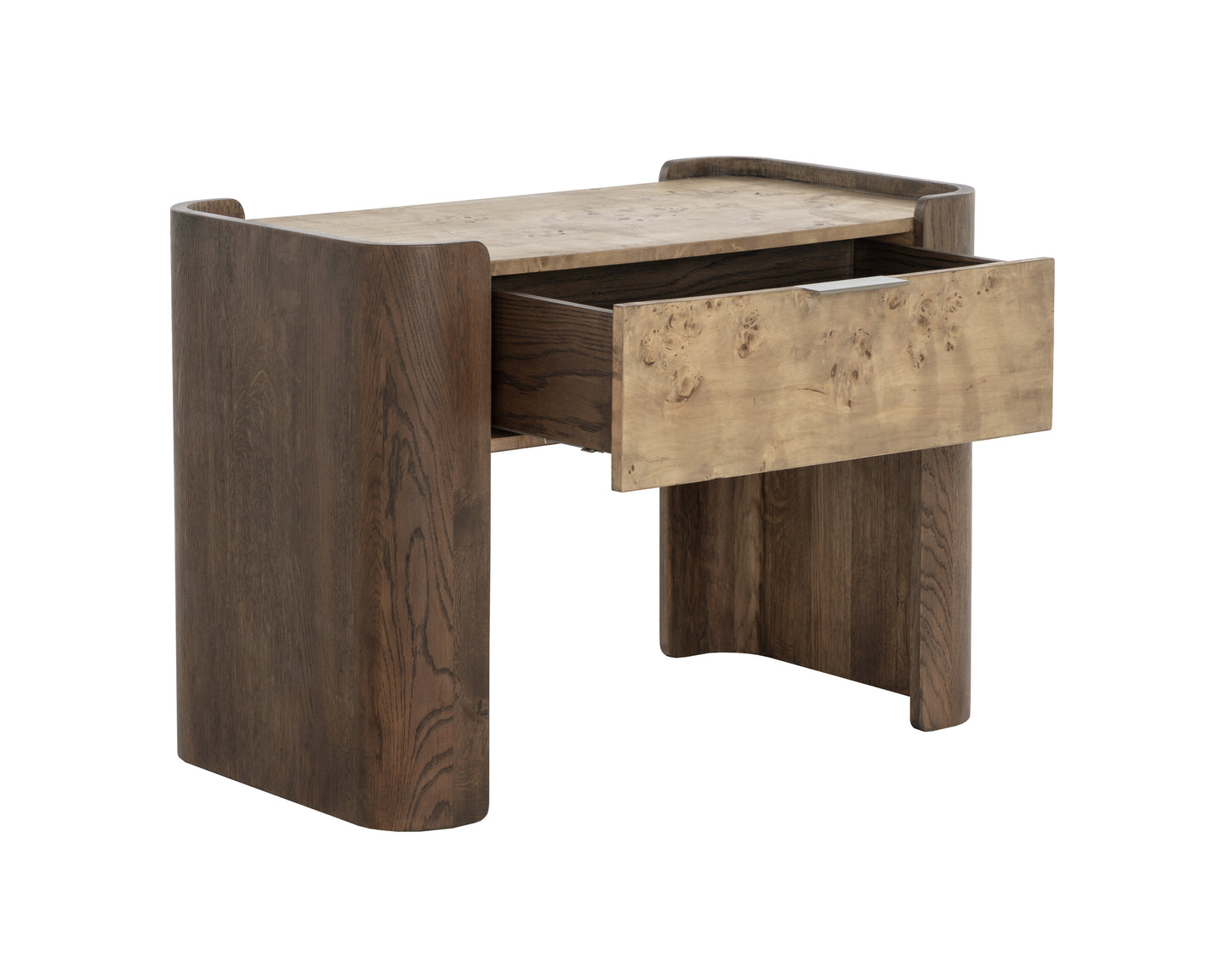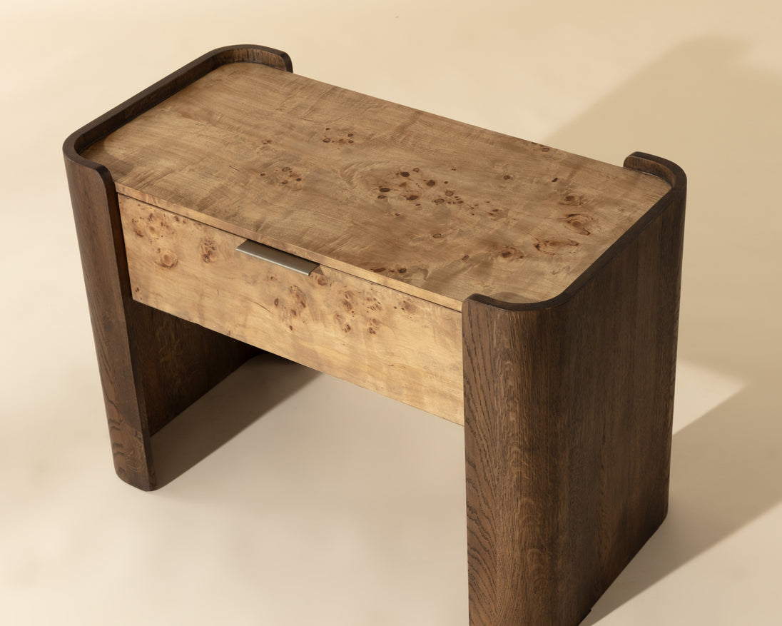 The Beryl Nightstand is a remarkable reflection of nature’s organic beauty that plays with the tones and characteristics of two different woods. The light brown hues and distinct swirling knots of mappa burl veneer come alive on the nightstand's drawer while its sculpted legs are grounded in the classic wood graining of rich brown solid oak wood veneer.