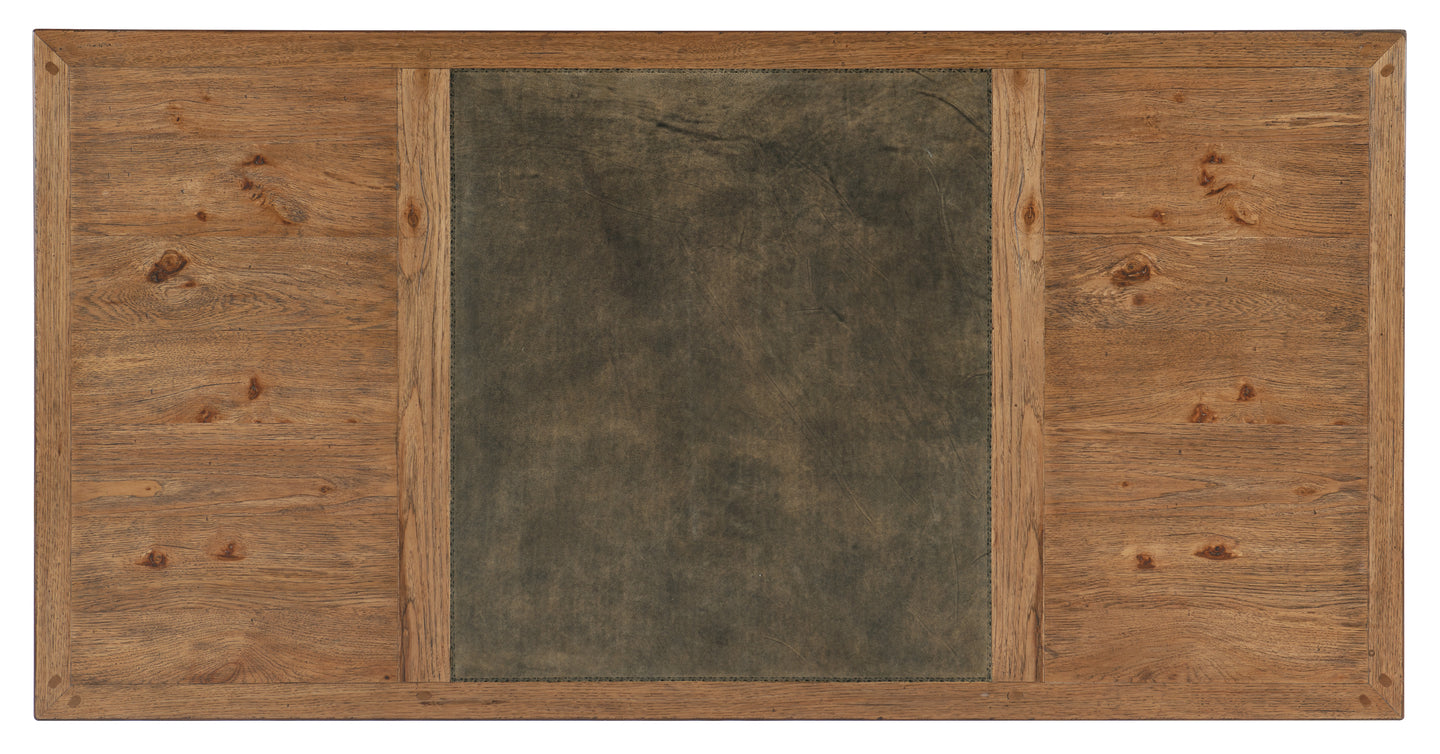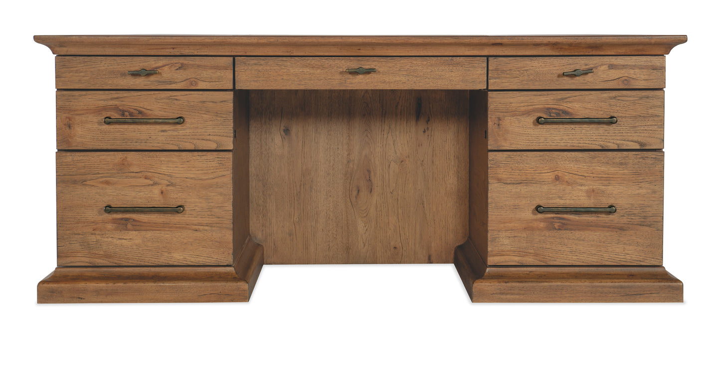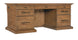 Celebrate the dramatic vistas and natural beauty of the American wilderness with the grand Big Sky Executive Desk. Crafted of rustic Pecky Hickory Veneers in a Vintage Natural finish with a solid wood edged top and a top-grain-leather writing surface, the desk has 7 drawers including a center drawer with drop-front for use with the keyboard. The left and right top drawers each have two removable dividers, one removable pencil tray and writing insert that can be used on either side. The left and right second drawer locks and has two removable dividers. The left and right bottom drawers are locking file drawers with Pendaflex letter/legal system. On the visitor’s side of the desk is an arch design.