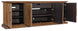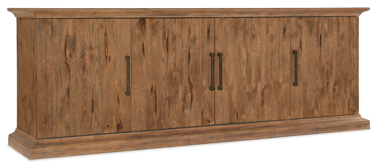 Bring home your dream of wide open spaces and a life lived in tandem with iconic landscapes with the Big Sky Media Console, crafted of authentic Pecky Hickory Veneers and finished in the warm and rustic Vintage Natural. Featuring a Solid-Wood edged top, the console has four doors with soft-close hinges and magnetic door catches with one self-closing drawer and one adjustable shelf behind the center pair of doors and two adjustable shelves behind each left and right door. Features a ventilated back panel, power supply, and accommodates an 80-inch TV. Accented by dark brushed bronze bar pulls.