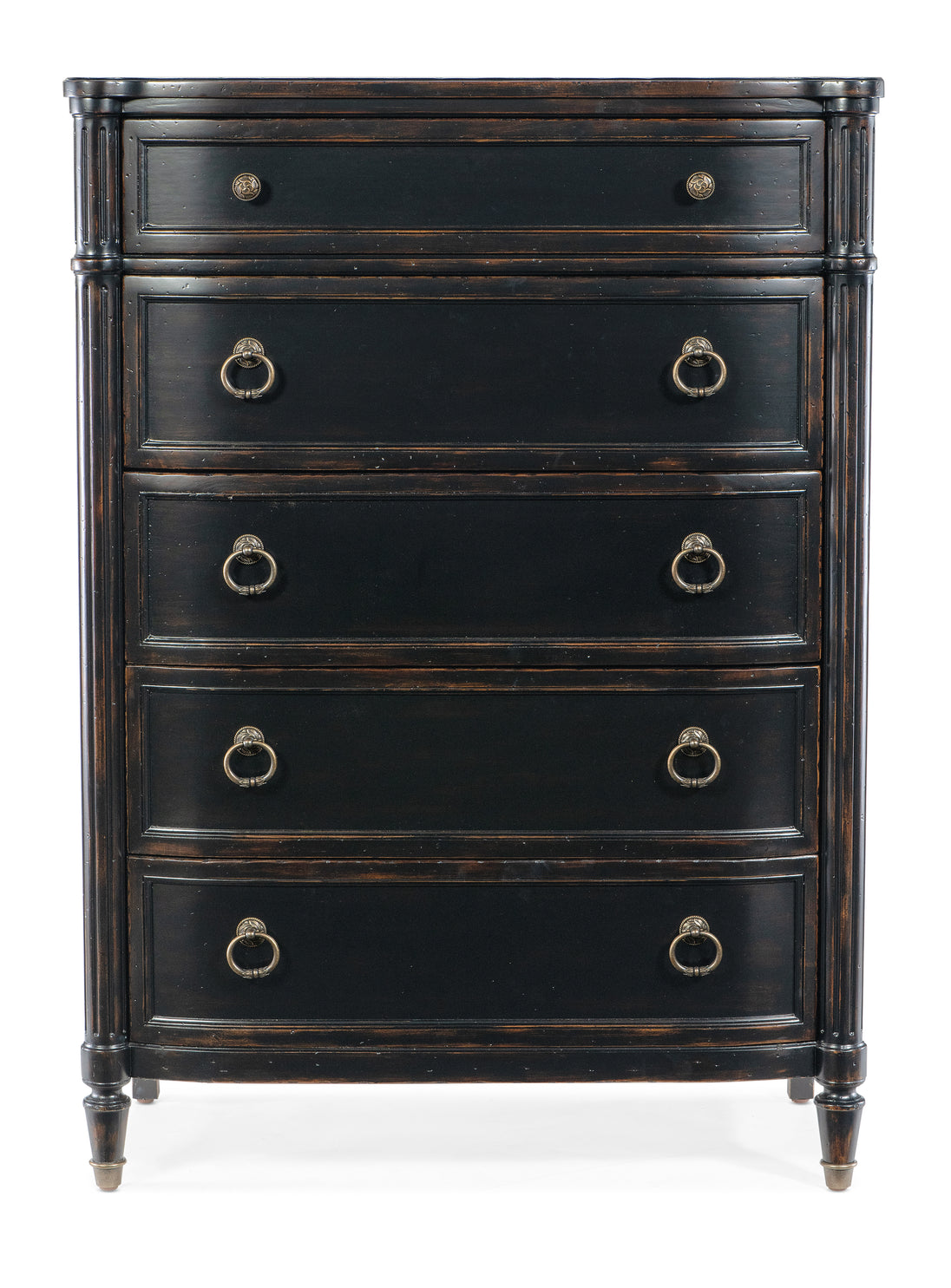 Capturing a Southern vintage vibe, the Charleston Five-Drawer Chest is crafted of Cherry Veneers with a Solid-Wood Edge top. The five self-closing drawers have cherry-finished interiors, the top drawer has a removable felt liner and the bottom drawer is cedar-lined. The chest has antique-pewter round knobs and ring pulls and is finished in the vibrant Black Cherry with subtle distressing, exemplifying the heirloom nature of the collection.