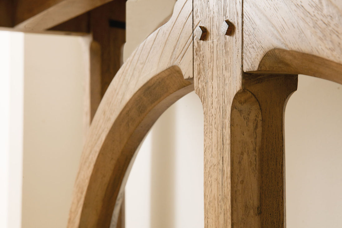 With an Arts & Crafts appeal, the Commerce & Market Console has a fresh natural light wood finish and features a half-circle motif base and stretcher.