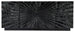 A tactile and intricate solid wood pattern highlights the Commerce & Market Entertainment Console, featured in a transparent black finish that reveals color and grain variances. Accommodating up to a 75-inch TV, there’s one removable wood shelf behind the center pair of doors and one removable wood shelf behind each of the left and right outside doors. Ventilated back panel.