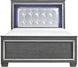 Product Description: Glamour reigns in the design of the Allura Collection. Framing the Full bed is a decorative beveled mirror accent that enhances the illumination from the touch-engaged LED backlight of the headboard. Alligator embossing and high polished crystal-enhanced hardware boldly accent the gray finish as does the gray faux leather crystal-tufted headboard insert.