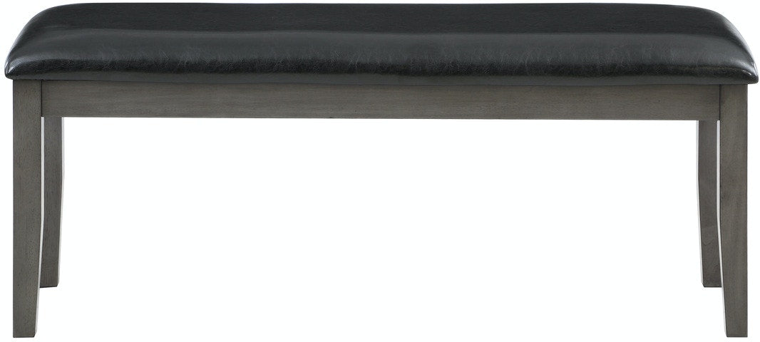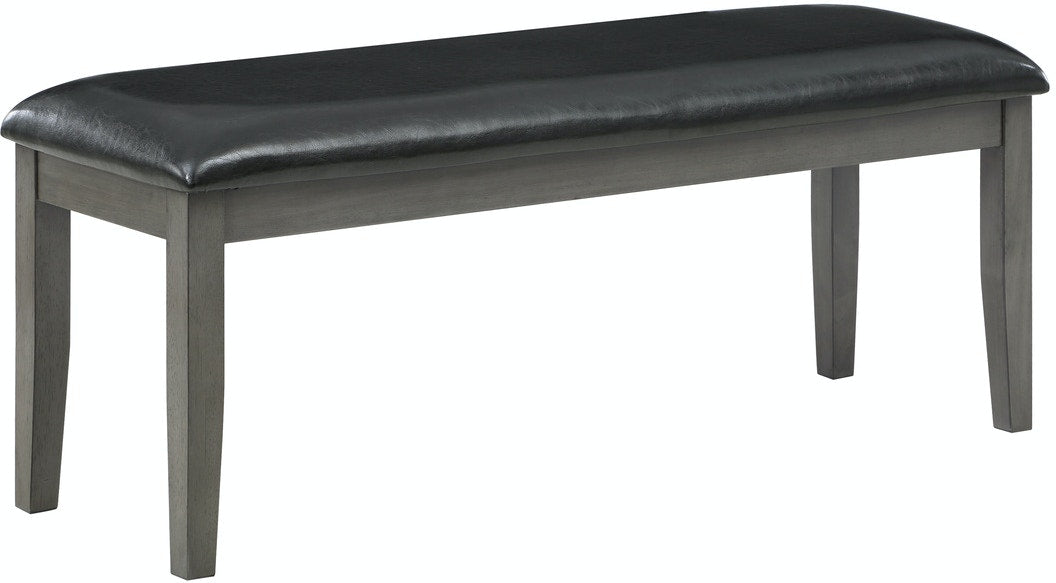 Product Description: The Nashua's transitional styling utilizes classic design elements to create a look that serves as the catalyst of the decorative versatility of your casual dining room. A gray finish over mango veneer highlights the wood's grain. The wood-framed bench features a black faux leather padded seat.
