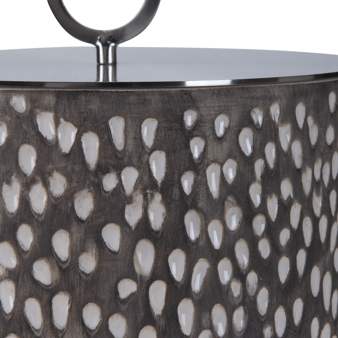 Ceramic Containers Feature Carved Detailing And Are Finished In Off-white And Smoke Gray Crackle Glazes With Respective Aged Gold And Brushed Nickel Finished Lids. Sizes: S-9x9x9, L-6x19x6Product Features