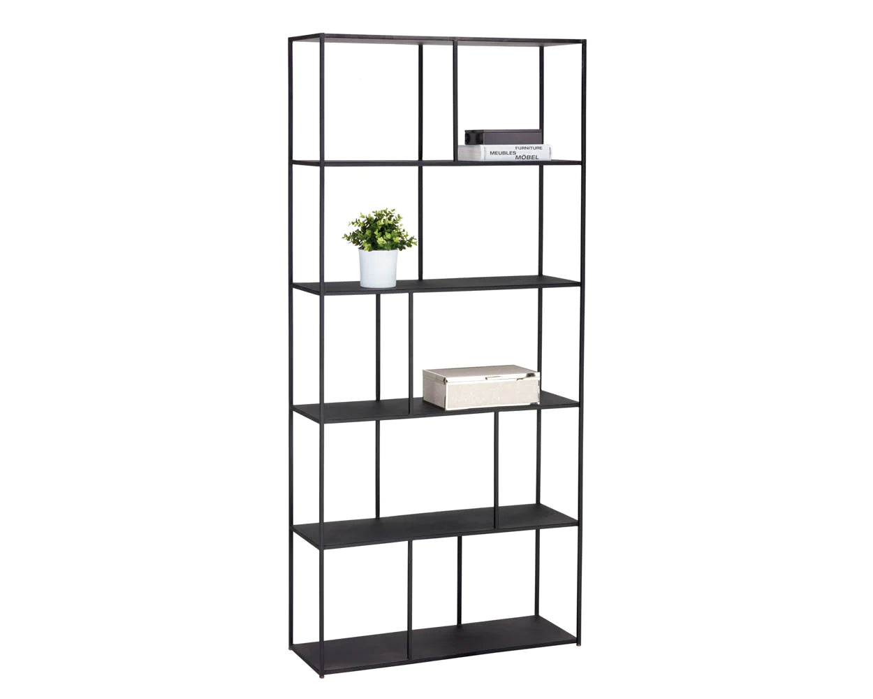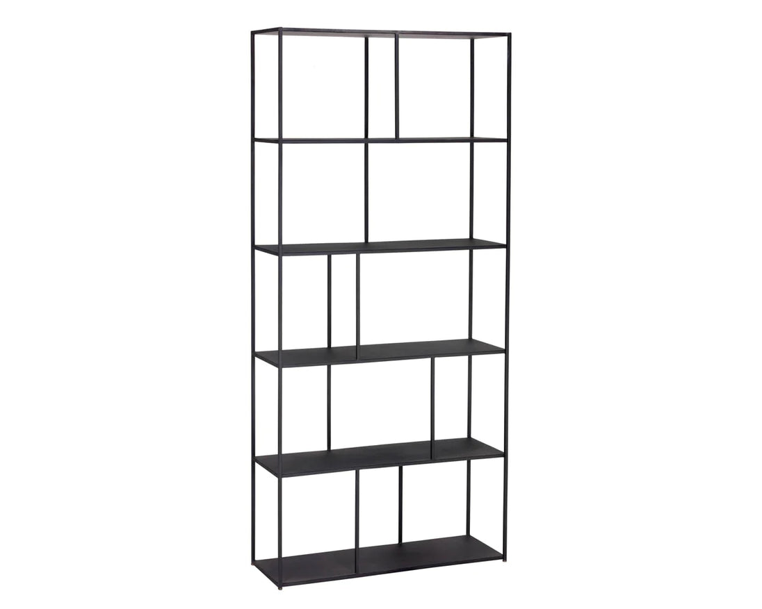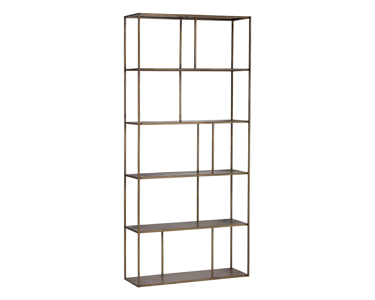 Add style and warmth to living and office spaces with this well-designed iron bookcase in a brushed antique brass finish. Can be placed in pairs or multiples for added impact and functionality. Also available in a smaller size. Anti-tipping kit included.