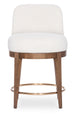 The Eleana Counter Stool offers a perfect blend of luxury and everyday comfort with its Light Caramel walnut veneer finish and Sunlit Bronze circular metal footrest. Featuring a 180-degree return memory swivel, a rounded barrel back, and a beige upholstered seat and back, this stool is both stylish and functional. Ideal for kitchen islands or bar counters, it brings a modern yet warm touch to transitional dining spaces.