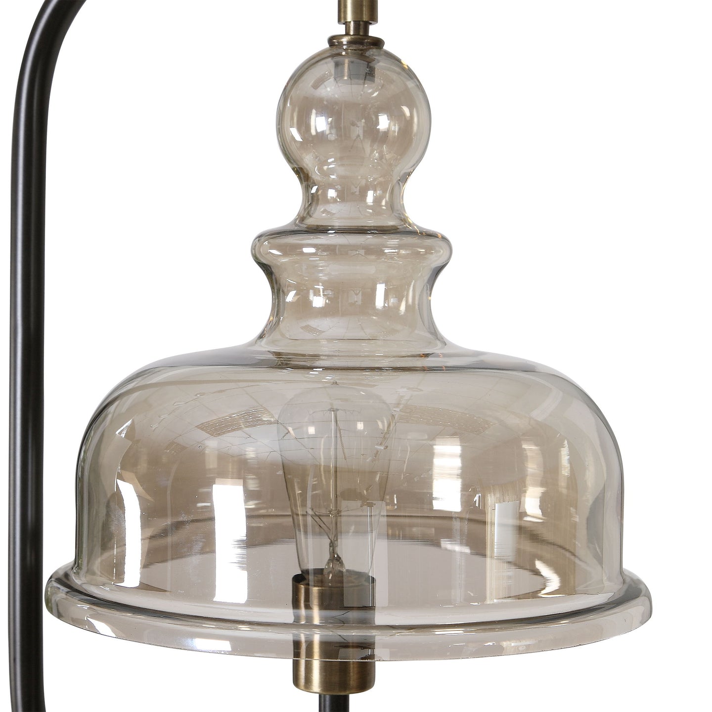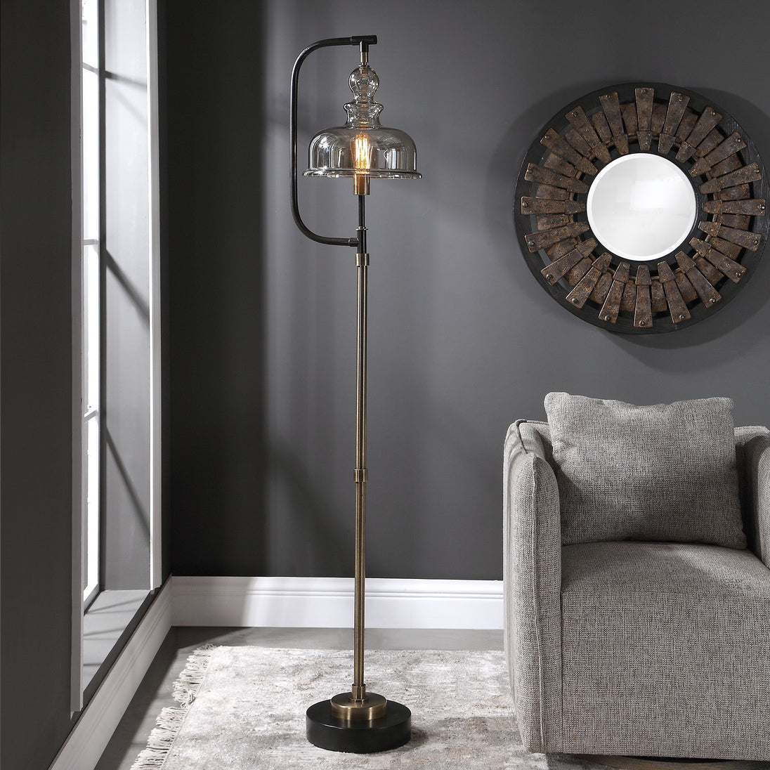 This Floor Lamp Features A Delicate Design Finished In A Plated Antiqued Brushed Brass And Rusted Aged Black. The Piece Showcases A Gracefully Curved Light Amber Glass Shade And Includes One 60-watt, BT-58 Antique Style Bulb.Product Features