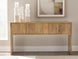 This console table takes casual design to a whole new level. Solid mango wood is adorned with a multi-step light brown finish that enhances its natural character. Clean, contemporary lines are paired with an attractive peg and dovetail detail for a unique artistic style, keeping this piece on the cutting edge of cool. Two double-door cabinets with coordinating knobs are perfect for storing your small items neatly out of sight.