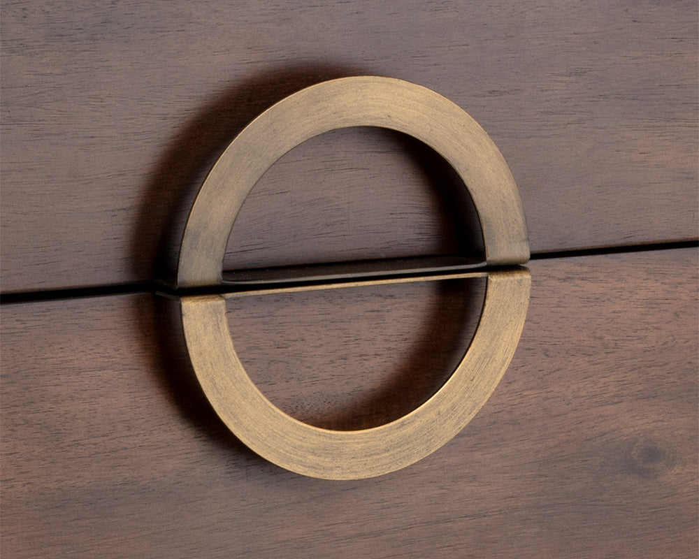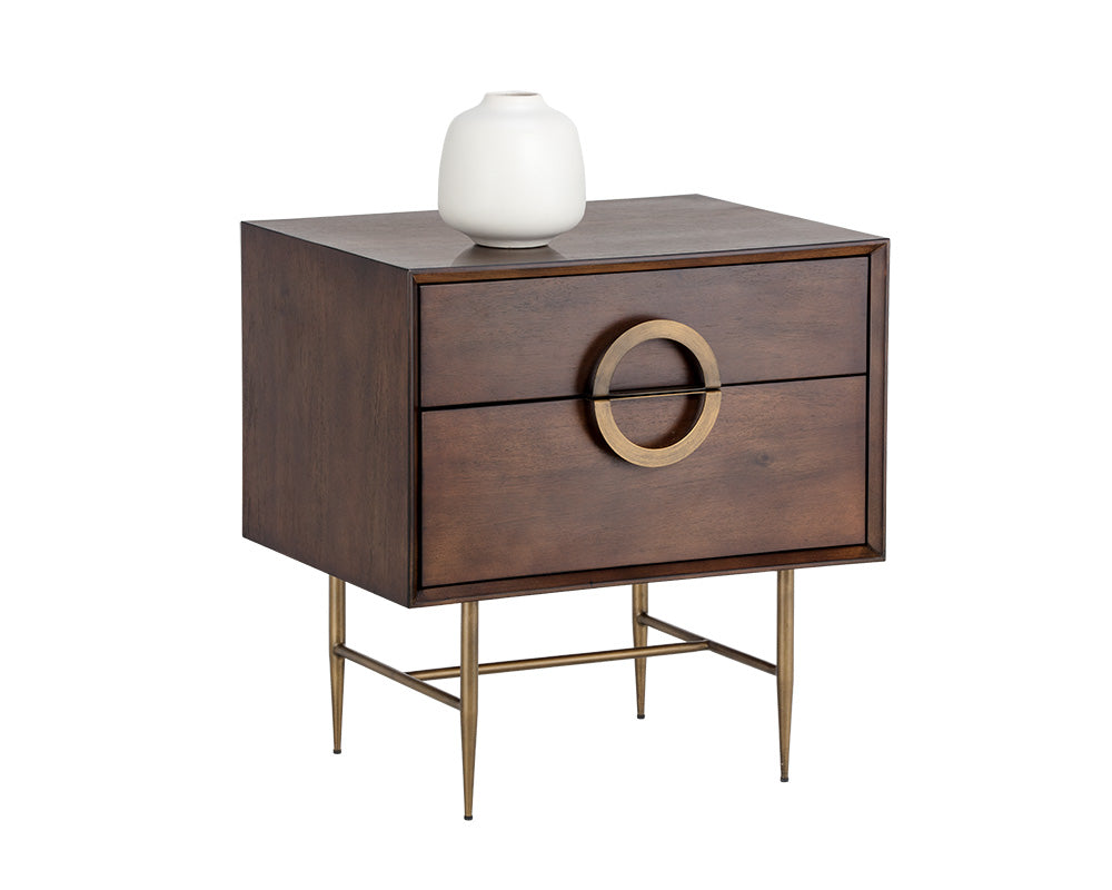 This handcrafted nightstand will add a unique design to any bedroom. Made from dark mango acacia veneer with two soft closing drawers. Antique brass hardware completes the look. Suitable for residential and contract settings.