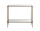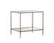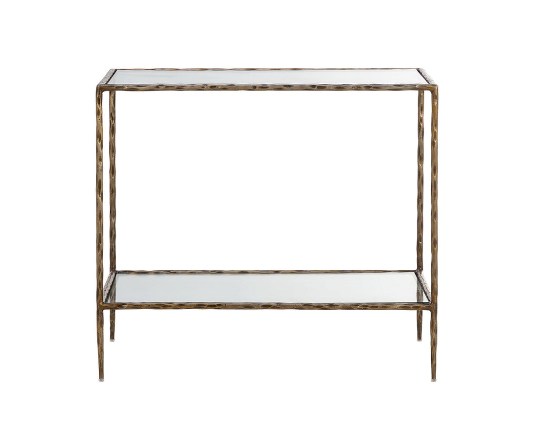 The Emine Nightstand shines a spotlight on the rustic beauty of hand-hammered metal. Crafted by artisans in India, this nightstand features an antique brass iron frame with a tempered glass top and shelf. Made in India. With refined craftsmanship, this design was brought to life by skilled local artisans. Due to the nature of handcraftsmanship, unique imperfections such as fissures, markings and variations in colour and shape are welcomed and appreciated characteristics for a truly one-of-a-kind piece.