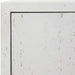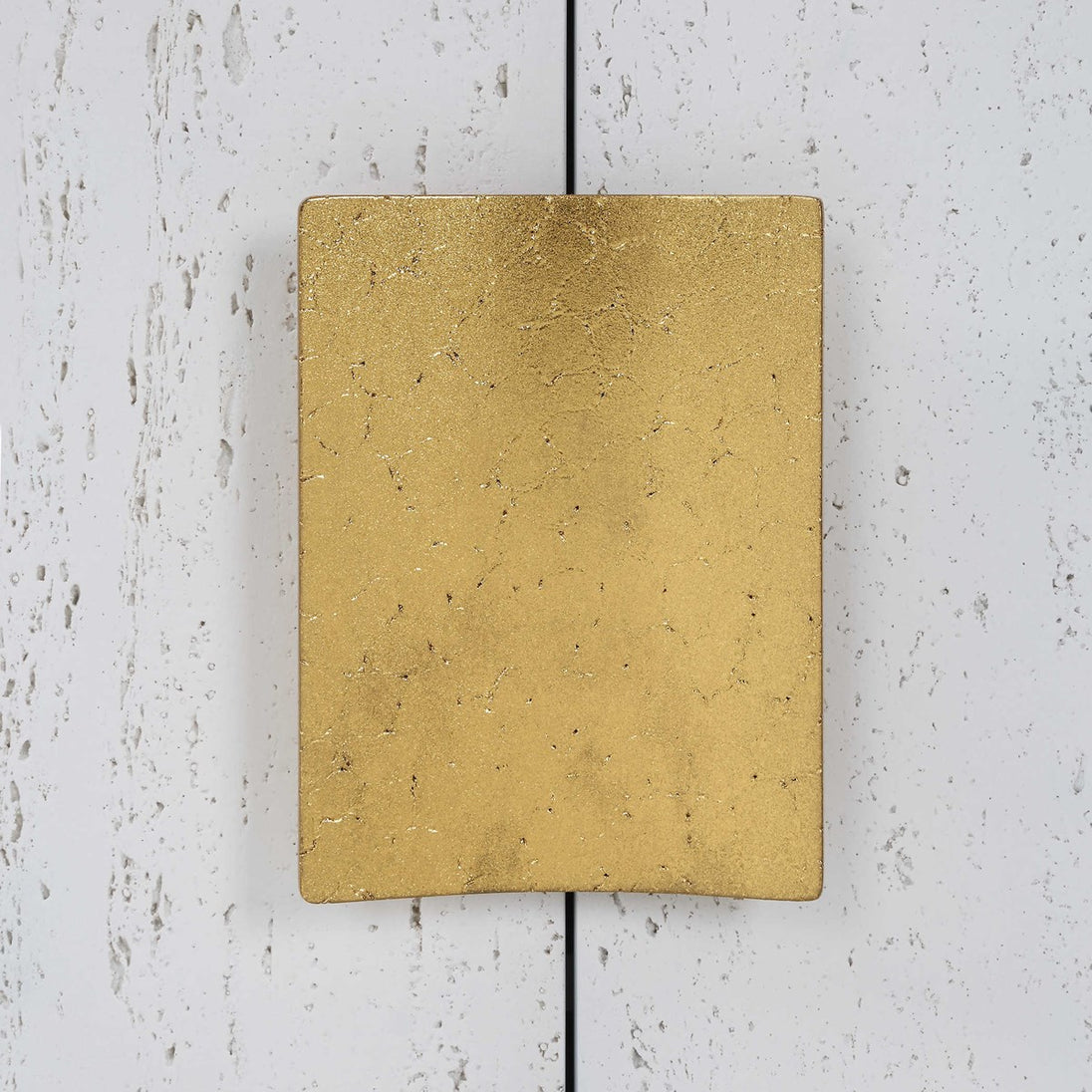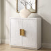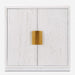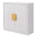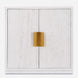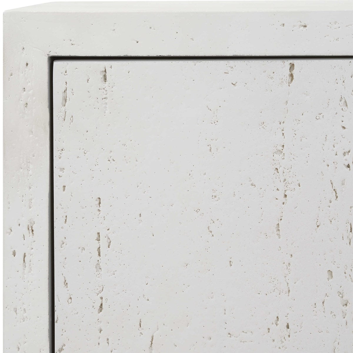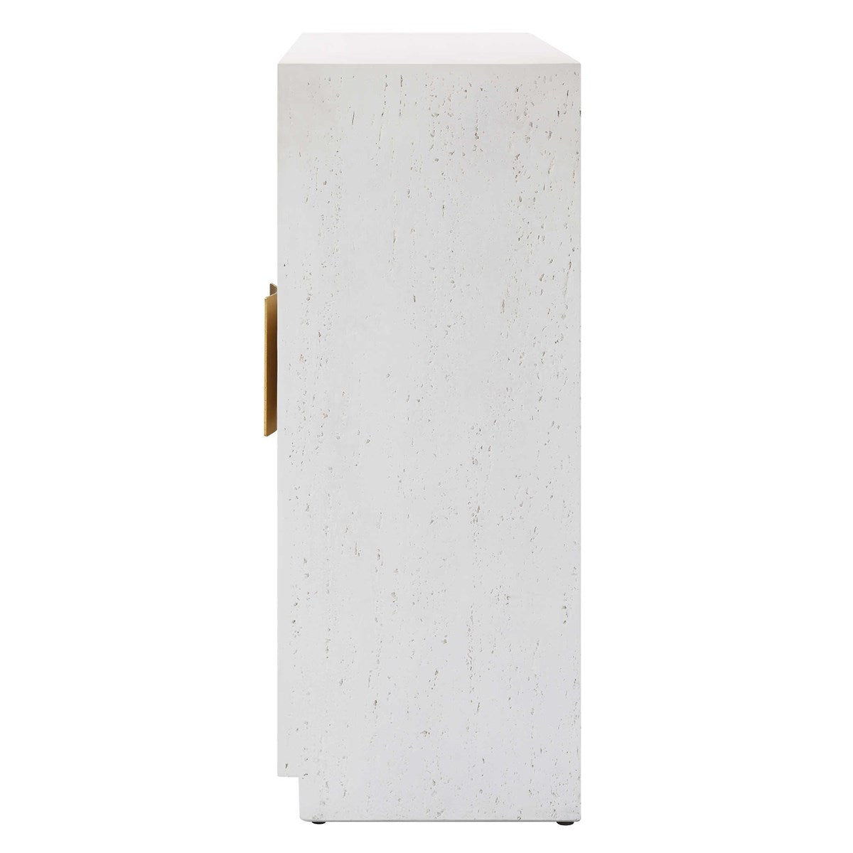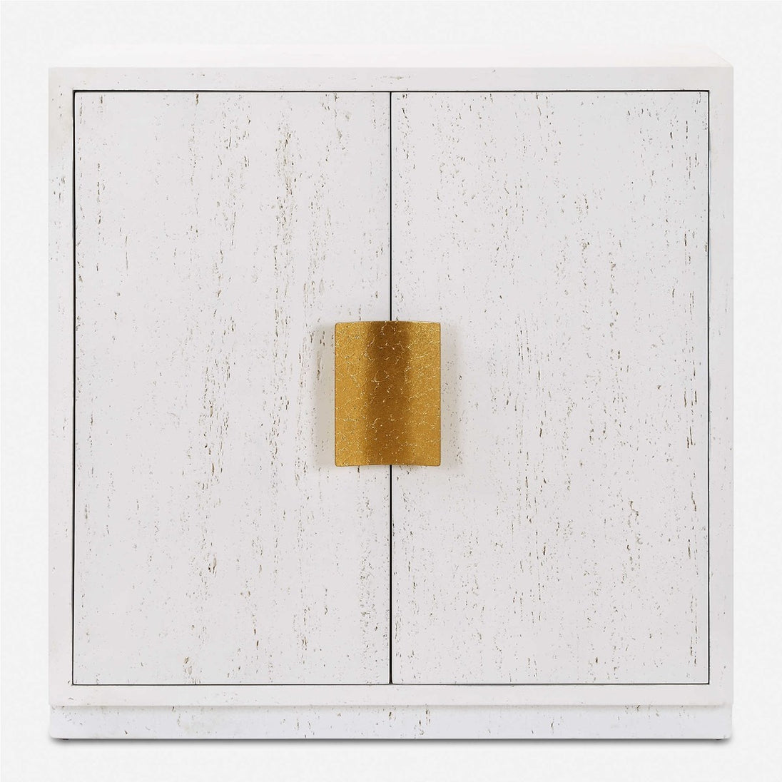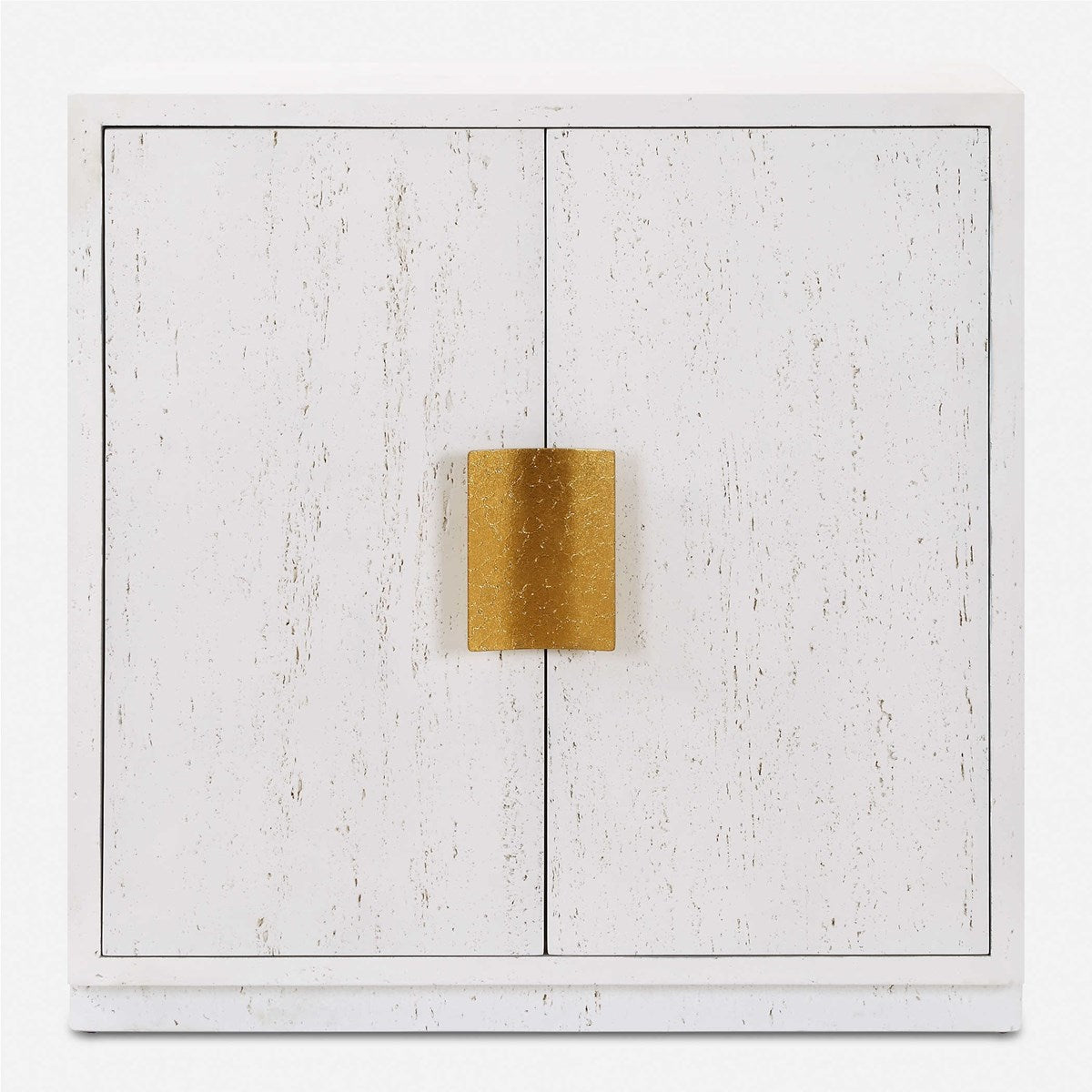 A stylish two door cabinet crafted from cast resin. Emma features a porous textured surface for an organic look and a tactile perception. Glowing hardware in antique gold iron has a concave shape with mottled texturing. A slate blue interior offers a fun surprise with two adjustable shelves.