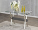 Renovate your living space with the stunning beauty of this sofa table that emanates a mid-century modern vibe with its sleek design and contrasting color palette. The luxurious look of this table around a stylish rectangular table with a creatively designed stainless steel base of chrome-finish to perfection, balancing a transparent tempered glass on top.
