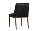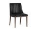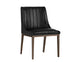 A sleek, urban designed dining chair featuring bold vertical stitching on the seat and back in a beige linen fabric. Finished with a rustic bronze steel frame. Place in dining and office spaces for a retro look.