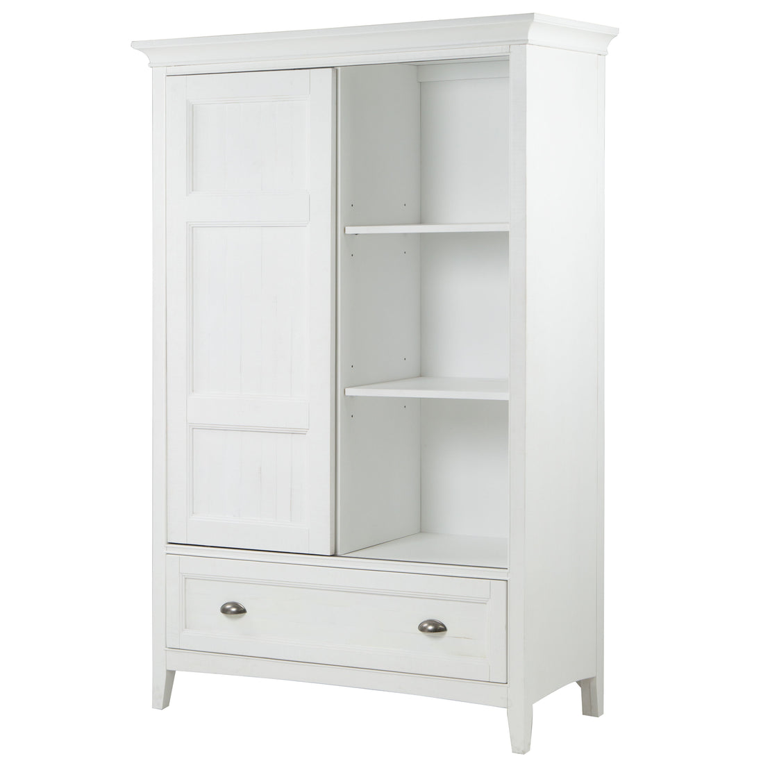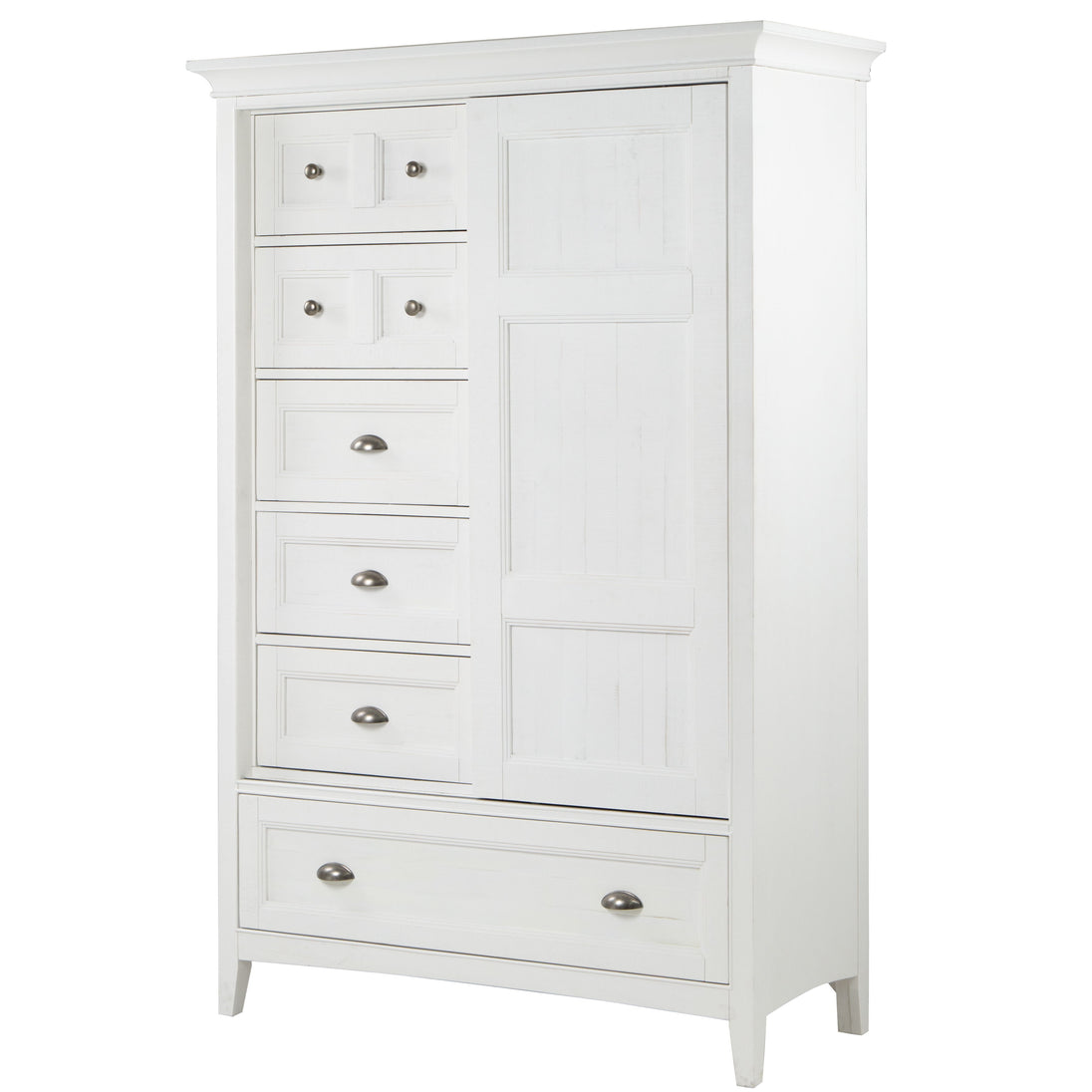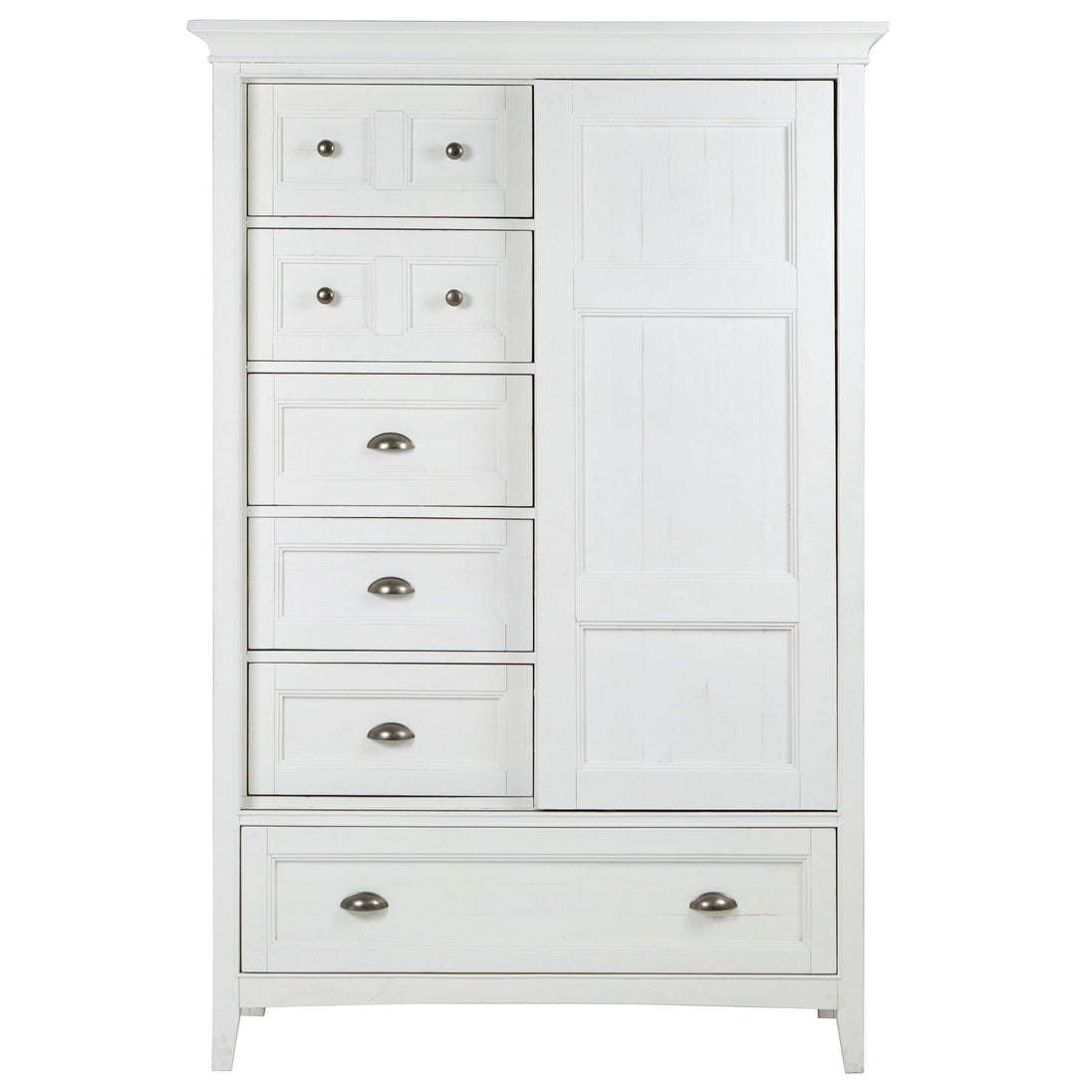 A soft Chalk White finish on Pine veneers and solids creates a relaxed beachy feel in any bedroom with Heron Cove. A high back beaded framed panel bed lends shaker appeal and is available with hidden rails storage. Straight legs support the straight lined chests with raised beaded trim for cottage appeal. Come home to Heron Cove!