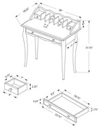 - Traditional, French inspired 36 inch long secretary desk in a warm antique white wood finish with closed storage for a functional workspace.