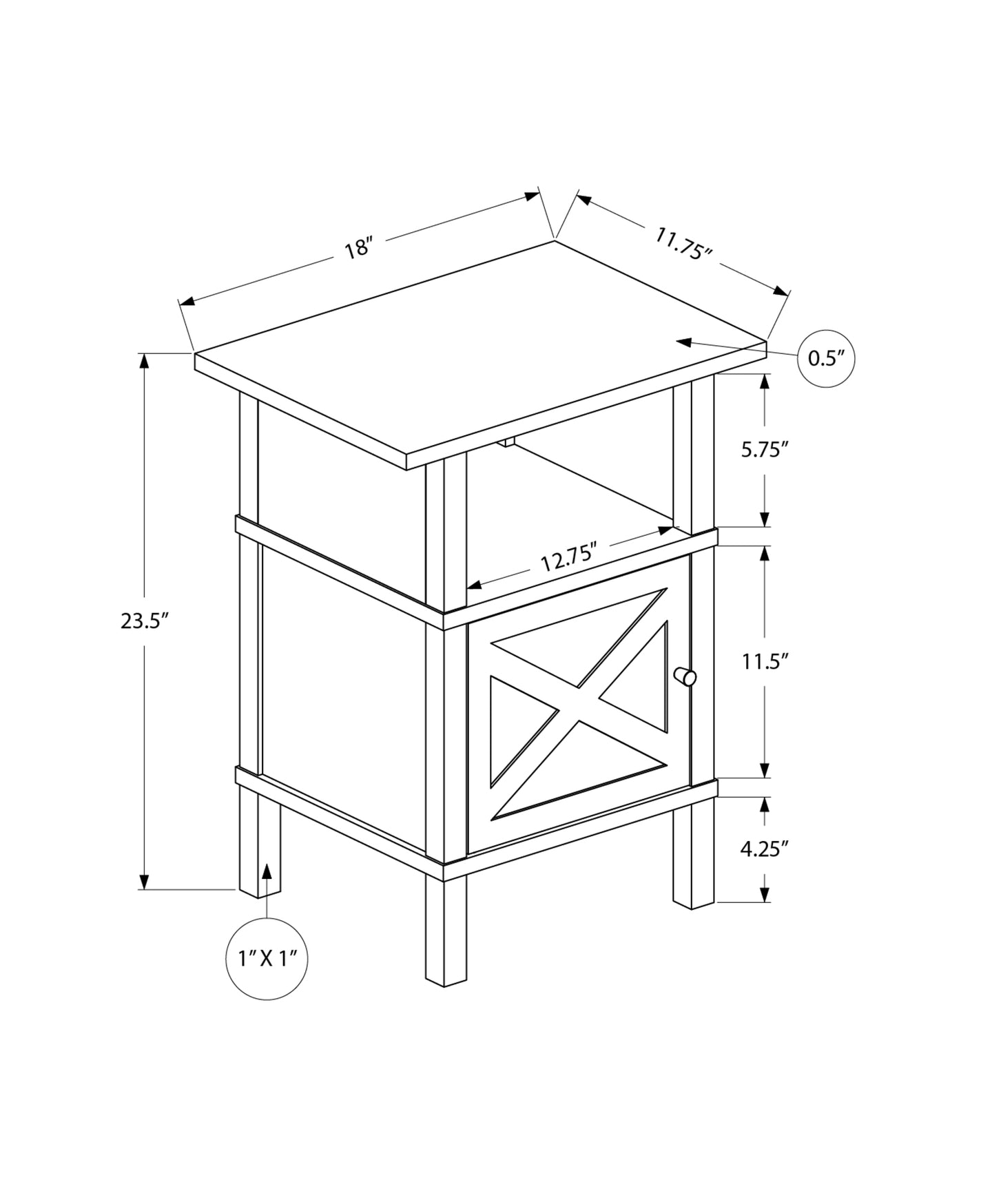 - This space-saving end accent table is backed with a 5 year limited warranty against any defects for added peace of mind; product dimensions: 18 in. W x 11.75 in. D x 23.5 in. H; shelf: 12.75 in. W x 10.75 in. D x 5.75 in. H