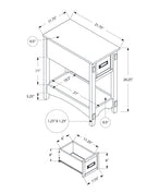 - Features a storage drawer with a black metal pull handle and a bottom shelf for extra organization, all in a space saving design perfect for small rooms.