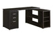 - Fashionable style L shape computer desk with storage, featuring thick-panel construction in a dark espresso brown laminate finish and includes a 5 year limited warranty for your satisfaction.