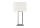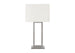 Transform your living room or bedroom into a haven of ambiance and style with this modern 28"h table lamp. Crafted with a sophisticated plated nickel metal in a dramatic architectural design and topped with a chic fabric ivory shade, this lamp is the epitome of fashionable and trendy home decor. Whether it graces your nightstand or serves as a decorative accent on your console, end or side table, this simply designed lamp will easily brighten any corner of your home. A convenient built-in USB port is included at the back of the sturdy metal base to discretely charge a device while illuminating your space, perfect for the modern office, living room, or for those cozy evenings in your bedroom. The on/off turn knob switch adds a touch of practicality compatible with a 100W bulb (not included), allowing you to control the lighting with ease. The fabric shade softly diffuses the light to create the perfect ambiance for relaxation or work. Plus, with a 2 year limited warranty against manufacturer defects, you can feel confident this versatile lamp is built to last. Illuminate your home decor with contemporary flair with this stylish table lamp that is perfect in any room setting.