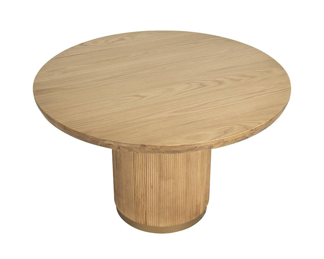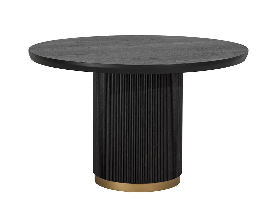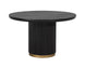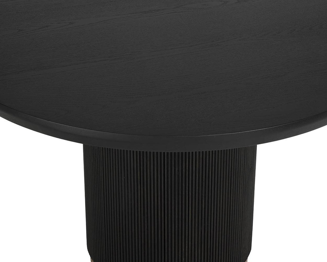 The Kalla Dining Table brings form and function to life. Crafted with a charcoal grey oak veneer table top with a chamfered edge. Vertical reeding on a solid oak wood base with brushed gold steel detailing at the bottom finishes the look. As wood is an organic, porous material, these pieces will contain natural variation of texture and may also exhibit fine indentations and cracks. Wood pieces will also display a disparity of colour and grain, and visible knots and burls that add to the character of each piece.